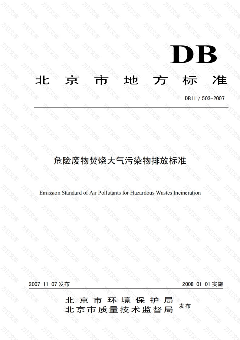 DB北京市地方标准DB11/503-2007危险废物焚烧大气污染物排放标准Emission Standard of Air Pollutants for Hazardous Wastes Incineration2007-11-07发布2008-01-01实施北京市环境保护局北京市质量技术监督局发布次万文万文方言标准适用范围22规范性引用文件23术语和定义2危险废物焚烧大气污染物控制限值5危险废物焚烧技术要求,46监测方法4标准实施6DB11503-2007前为控制本市危险废物焚烧大气污染物排放,保障人体健康、保护生态环境、改善环境空气质量,根据《中华人民共和国大气污染防治法》和《北京市实施〈中华人民共和国大气污染防治法》办法》,制定本标准。本标准为强制性标准。本标准规定了14项危险废物焚烧大气污染物排放限值,其中,烟尘、一氧化碳、氟化氢以及二噁英的排放限值严于国家标准中针对大型焚烧设施(焚烧容量≥2500kg/)的排放限值:烟气黑度、氮氧化物、二氧化硫、氯化氢,以及汞、镉、铅、砷、铬的排放限值与国家标准相同:新增加了不透光率指标。本标准新增加了危险废物焚烧的污染控制技术要求。本标准未做规定的,执行国家标准《危险废物焚烧污染控制标准》(GB18484)中有关规定。医疗废物集中焚烧设施的大气污染物排放限值执行本标准。本标准附录A为资料性附录。本标准为第一次发布。本标准由北京市环境保护局提出并归口。本标准由北京市人民政府年2007年10月31日批准。本标准起草单位:北京大学环境学院、北京市固体废物管理中心。本标准主要起草人:刘阳生、李立新、易莎、黄海林、马兰兰。本标准由北京市环境保护局负责解释。