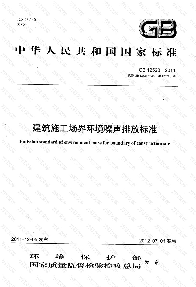 库ICS13.140Z52中华人民共和国国家标准GB12523-2011万文代替GB1252390,GB1252490建筑施工场界环境噪声排放标准文Emission standard of environment noise for boundary of construction site2011-12-05发布2012-07-01实施环境保国家质量监督检险检度总局布文GB12523-2011中华人民共和国环境保护部公告2011年第86号万文为贯彻《中华人民共和国环境保护法》和《中华人民共和国环境噪声污染防治法》,防治环境噪声污染,保护和改善生活环境,保障人体健康,促进经济和社会可持续发展,现批准《建筑施工场界环境噪声排放标准》为国家污染物排放标准,并由我部与国家质量监督检验检疫总局联合发布。标准名称、编号如下:建筑施工场界环境噪声排放标准(GB12523一2011)按有关法律规定,以上标准具有强制执行的效力。以上标准自2012年7月1日起实施。以上标准由中国环境科学出版社出版,标准内容可在环境保护部网站(bz.mep.gov.cm)查询。自以上标准实施之日起,下列标准废止:建筑施工场界噪声限值(GB12523一90):二、建筑施工场界噪声测量方法(GB12524一90)。特此公告。前iv1适用范围12规范性引用文件3术语和定义…4环境噪声排放限值25测量方法…6测量结果评价标准的监督实施4