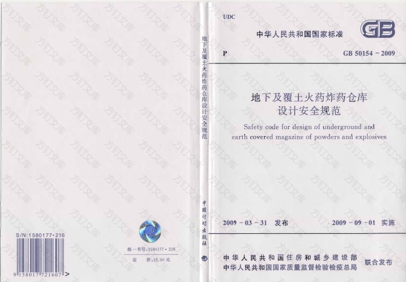 中华人民共和国国家标准GB万地下及覆GB50154-2009火药炸药地下及覆土火药炸药仓库设计安全规范Safety code for design of underground andearth coveredmagazine of powders and explosives文中计2009-03-31发布2009-09-01实施S/N:1580177.216方统一书号,1580177·216定中华人民共和国住房和城乡建设部联合发布中华人民共和国国家质量监督检验检疫总局万中华人民共和国国家标准地下及覆土火药炸药仓库设计安全规范万Safety code for design of underground andearthcovered magazine of powders and explosivesGB50154-2009主编部门:中华人民共和国国家发展和改革委员会国家物资储备局批准部门:中华人民共和国住房和城乡建设部施行日期:2009年9月1日国计划出版社2009中华人民共和国国家标准地下及覆土火药炸药仓库设计安全规范文GB50154-2009☆中华人民共和国国家发展和改革委员会国家物资储备局主编中国计划出版社出版地址:北京市西城区木郴地北里甲11号国宏大熨C座4层(邮政编码:100038电话:6390643363906381)新华书店北京发行所发行世界知识印刷厂印刷850×1168毫米1/323.75印张95千字2009年7月第1版2009年7月第1次印刷印数1-10100册☆万文统书号:1580177·216定价:19.00元