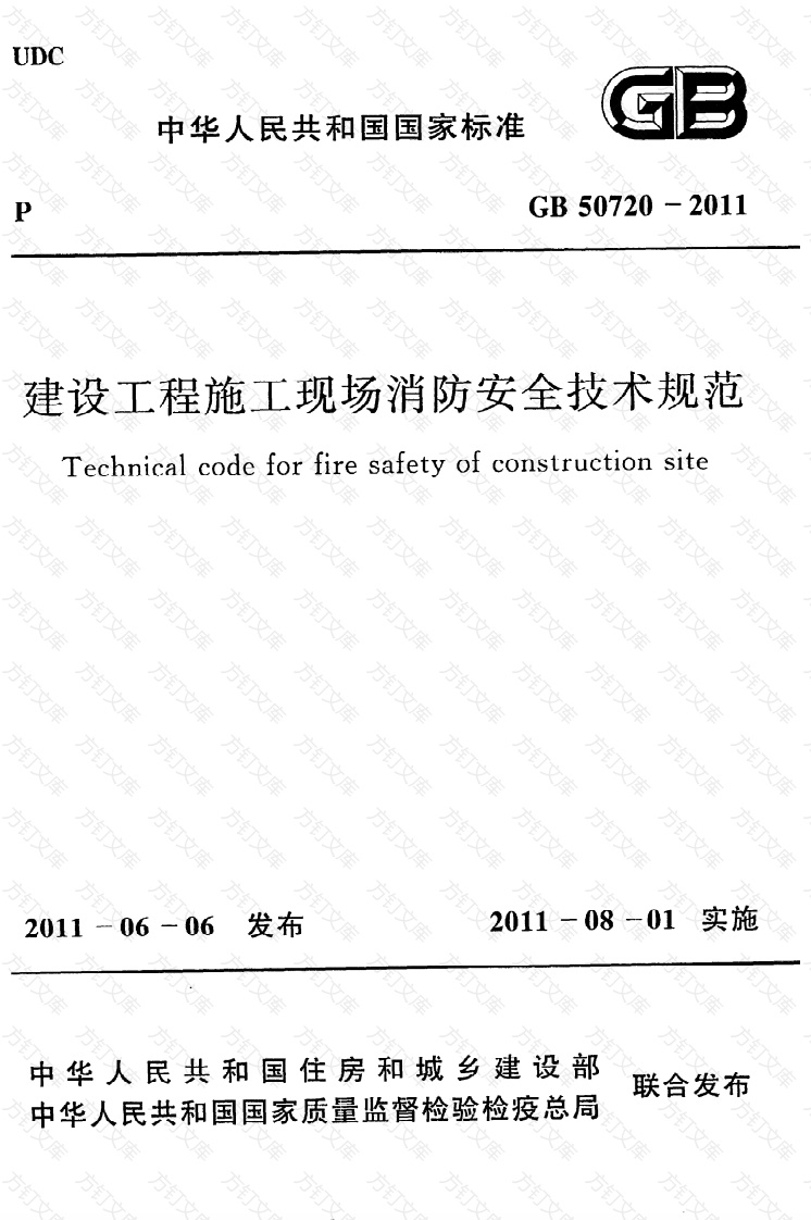 UDC中华人民共和国国家标准GBPGB50720-2011建设工程施工现场消防安全技术规范Technical code for fire safety of construction site2011-08-01实施中华人民共和国住房和城乡建设部联合发布中华人民共和国国家质量监督检验检疫总局方中华人民共和国国家标准建设工程施工现场消防安全技术规范construction siteGB50720-2011主编部门:中华人民共和国住房和城乡建设部中华人民共和国公安部批准部门:中华人民共和国住房和城乡建设部施行日期:2011年8月1中华人民共和国国家标准建设工程施工现场消防安全技术规范GB50720-2011中国计划出版社出版(地址:北京市西城区木椰地北里甲11号国宏大厦C座4层100038电话:6390643363906381新华书店北京发行所发行世界知识印刷厂印刷850X1168毫米1/321.75印张42千字2011年6月第1版2011年11月第3次印刷印数40201一80200册☆统书号:1580177·602方定价:12.00元万文