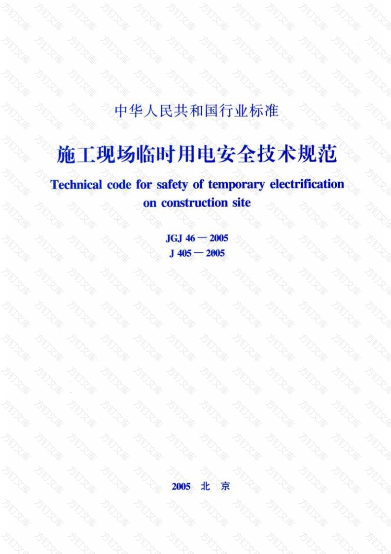 中华人民共和国行业标准施工现场临时用电安全技术规范Technical code for safety of temporaryelectrificationon construction siteJGJ46一2005405-2005 2005北万中华人民共和国行业标准施工现场临时用电安全技术规范Technical code for safety of temporaryelectrificationon construction siteJGJ 46--2005方批准部门:中华人民共和国建设部方订施行日期:2005年7月1日中华人民共和国行业标准施工现场临时用电安全技术规范Technical code for safety of temporaryelectrificationon construction site万JGJ46-2005中国建筑工业出版社出版、发行(北京西郊百万庄)新华书店经销北京同文印刷有限责任公司印刷开本:850×1168毫米1/32印张:2/8字数:74千字文2005年5月第一版2005年5月第一次印刷印数:1-60000册定价:13.00元统一书号:15112·11812版权所有翻印必究如有印装质量问题,可寄本社退换(邮政编码100037)本社网址:http:/www.china-abp.com.cn网上书店:http:wwwchina-building.comcn