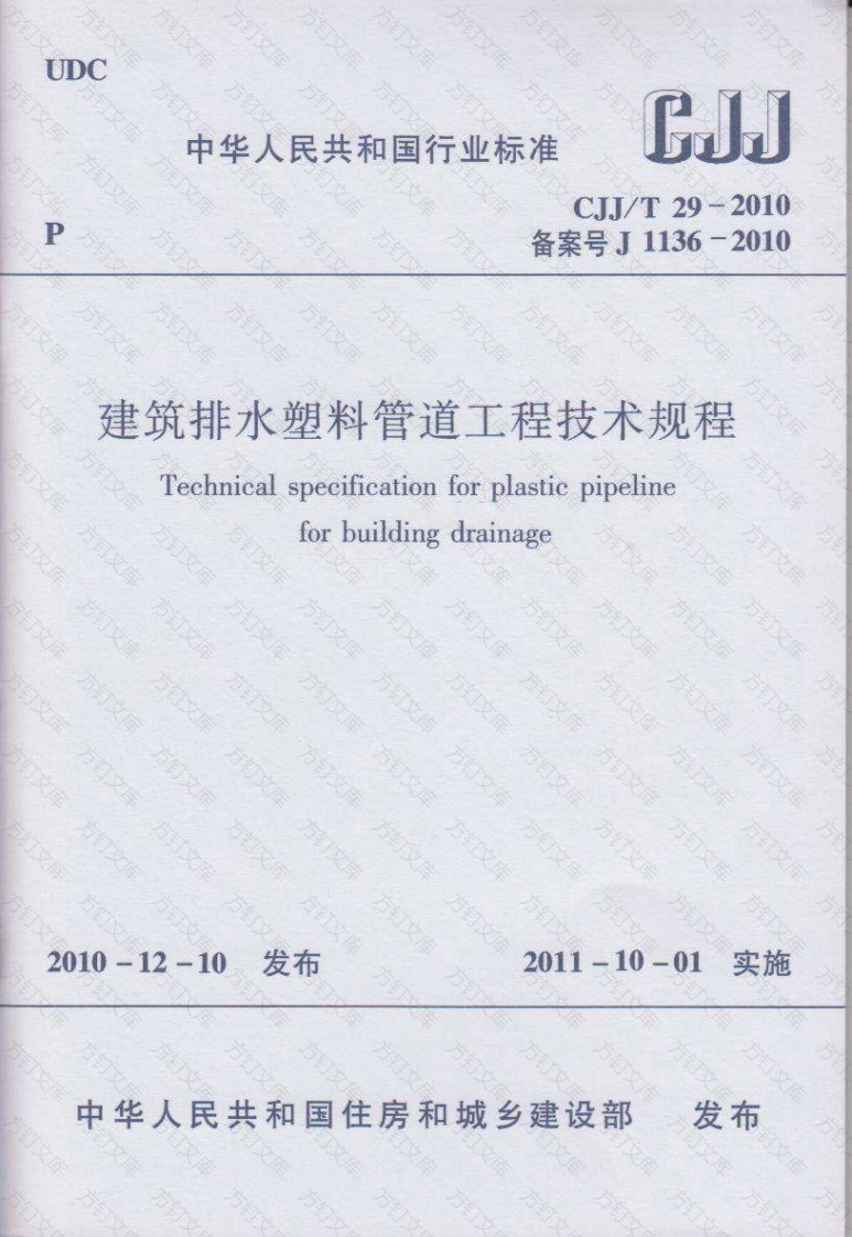 UDC中华人民共和国行业标准CJJ/T29-2010P备案号J1136-2010建筑排水塑料管道工程技术规程Technical specification for plastic pipelinefor building drainage2010-12-10发布2011-10-01实施中华人民共和国住房和城乡建设部发布中华人民共和国行业标准建筑排水塑料管道工程技术规程Technical specification for plastic pipelinefor building drainageCJJ/T29-2010批准部门:中华人民共和国住房和城乡建设部施行日期:2011年10月1日中国建筑工业出版社2010北…京中华人民共和国住房和城乡建设部公告第840号中华人民共和国行业标准建筑排水塑料管道工程技术规程关于发布行业标准《建筑排水塑料管道工程技术规程》的公告Technical specification for plastie pipelinefor building drainageCU/T29-2010现批准《建筑排水塑料管道工程技术规程》为行业标准,编号为CJ/T29-2010,自2011年10月1日起实施.原《建筑排水硬聚氯乙烯管道工程技术规程》C切/T29-98同时废止。各地新华书店、建筑书店经销本规程由我部标准定额研究所组织中国建筑工业出版社出版北京红光制版公司制版发行。中华人民共和国住房和城乡建设部开本:850×1168毫米1/32印张:2%字数:60千字2010年12月10日统一书号:15112·2020版权所有翻印必究钉如有印装质量问题,可寄本杜退换网上书店:http:/www.china-building.cmcn
