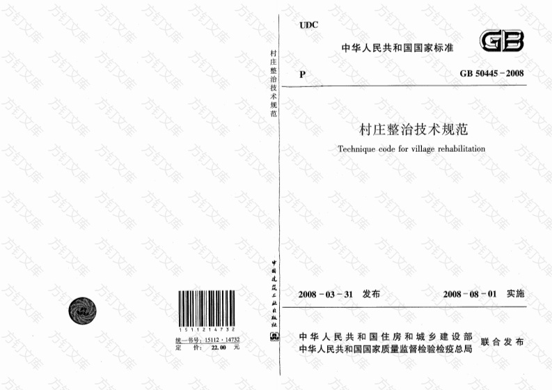 UDC村中华人民共和国国家标准GB50445-2008整治技术规村庄整治技术规范Techniquecode for village rehabilitation万文中国建筑工自版社2008-03-31发布2008-08-01实施统一书号:15112·14732中华人民共和国住房和城乡建设部联合发布中华人民共和国国家质量监督检验检疫总局中华人民共和国国家标准方,村庄整治技术规范主编部门:中华人民共和国住房和城乡建设部批准部门:中华人民共和回住房和城乡建设部008年方订中国建筑工业出版社库2008北京中华人民共和国住房和城乡建设部告第6号关于发布国家标准《村庄整治技术规范》的公告中华人民共和国国家标准村庄整治枝术规范现批准《村庄整治技术规范》为回家标准,编号为GB50445-2008,自2008年8月1日起实施.其中,第3.1.6,3.2.2(1,2、5)、8.2.3(4)、3.2.5(2)、3.3.2(4,5)、33.6、3.4.1(3)、3.4.3(1),344(3)、3.4.6、3.5.3(1)、3.5.4、3.5.6,各地新华书店、建筑书店经销4.1.5、4.3.2、6.2.4(2)、&4.4、8.47、10.4.2、10.5.3,11.1.2(1)条(款0为强制性条文,必须严格执行。本规范由我部标准定额研究所组织中国建筑工业出版社出版发行。中华人民共和国住房和城乡建设部2008年3月31日方周上书店,htpu/www.china-building.com.cn