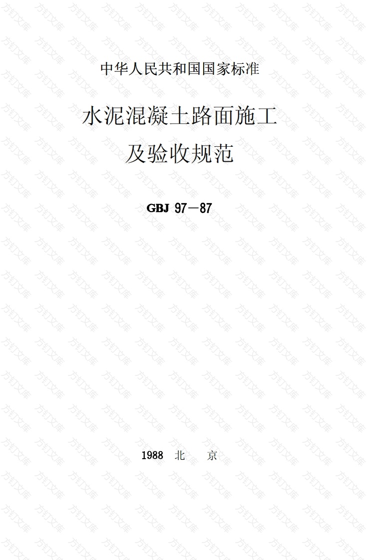 中华人民共和国国家标准水泥混疑土路面施工及验收规范方GBJ97一87方方方1988北京万文中华人民共和国国家标准水泥混凝土路面施工及验收规范GBJ97--87主编部门:中华人民共和国交通部万批准部门:中华人民共和国国家计划委员会施行日期:1987年10月1日方方方关于发布《水泥混凝土路面施工及验收规范》的通知万计标C1987)226号根据原国家建委(81)建发设字第546号文的通知,由交通部会同有关部门共同制订的《水泥混凝土路面施工及验收规范》,己经有关部门会审。现批准《水泥混凝土路面施工及验收规范》GBJ97一87为国家标准,自一九八七年十月一日起施行。本标准由交通部管理,其具体解释等工作,由浙江省交通厅负责。出版发行由我委基本建设标准定额研究所负责组织。国家计划委员会九八七年二月九日方方万万文
