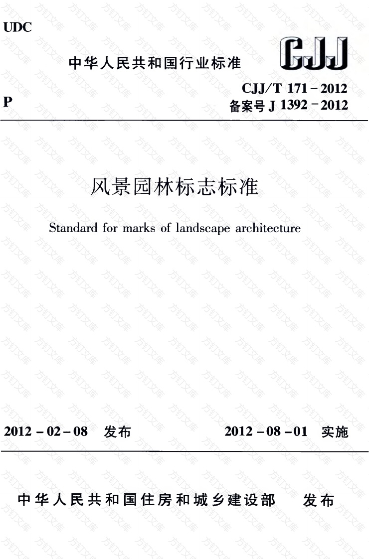 UDC中华人民共和国行业标准CJJ/T171-2012P备案号J1392-2012方风景园林标志标准Standard for marks of landscape architecture方钉钉万2012-02-08发布2012-08-01实施中华人民共和国住房和城乡建设部发布中华人民共和国行业标准风景园林标志标准Standard for marks of landscape architectureCJJ/T171-2012批准部门:中华人民共和国住房和城乡建设部施行日期:2012年8月1日方中国建筑工业出版社2012北文方方方方万文中华人民共和国行业标准风景园林标志标准Standard formarks of landscape architectureCJJ/T171-2012中国建筑工业出版社出版、发行(北京西郊百万庄)各地新华书店、建筑书店经销北京红光制版公司制版化学工业出版社印刷厂印刷开本:850×1168毫米1/32字数:43千字2012年5月第一版2012年5月第一次印刷定价:15.00元统一书号:15112·21783版权所有翻印必究如有印装质量问题,可寄本杜退换(邮政编码100037)本社网址:http:/www.cabp.com.cn网上书店:http:www.china-building.com.
