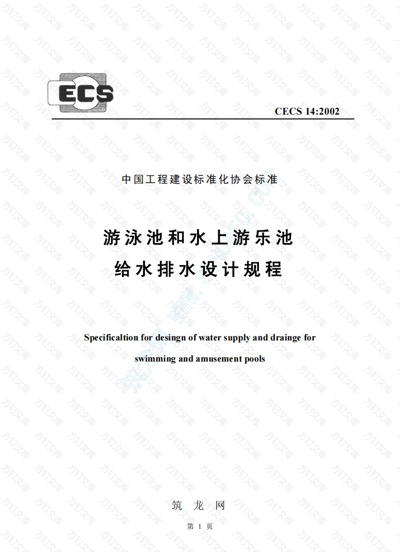 方方CECS14:2002万中国工程建设标准化协会标准万文游泳池和水上游乐池给水排水设计规程万文Specificaltion for desingn of water supply and drainge forswimming and amusement pools库筑龙网文方中国工程建设标准化协会标准游泳池和水上游乐池给水排水设计规程Specificaltion for desingn of water supply and drainge forswimming and amusementpoolsECS14:2002万主编单位:中国建筑设计研究院方国家体育总局游泳运动管理中心中国游泳运动协会批准部门:中国工程建设标准化协会施行日期:2003年月1日筑龙2002北京第前本规程是根据中国工程建设标准化协会(2000)建标协字第36号文《关于印发中国工程建设标准化协会2000年第二批推荐性标准制、修订计划的通知》的要求,由中国建筑设计研究院会同有关单位共同对原《游泳池给水排水设计规范》CECS14:89进行修订而成。在修订本规程的过程中,修订组进行了调查研究,认真总结了原规范执行以来的经验,吸收了成熟的新技术、新设备和新材料,借鉴了德国、英国和美国等国家的标准和资料,并广泛征求了有关单位和专家的意见。本规程共分17章。修订的主要内容有:(1)规程改名为《游泳池和水上游乐池给水排水设计规程》,扩大了适用范围:(2)新增术语及符号、池体设计、水质监恻和系统控制、管理和维护等五个章节:(3)增加了世界级和国家级竞赛用游泳池的水质卫生标准:(4)修订和补充了若干设计参数:(5)增加了水上游乐池方面的规定(6)删除了少数过时的和易造成误解的条文;(7)根据国外标准、资料和国内工程实践总结,补充和完善了有关条文。根据国家计委计标[1986]1649号文《关于请中国工程建设标准化委员会负责组织推荐性工程建设标准试点工作的通知》的要求,现批准协会标准《游泳池和水上游乐池给水排水设计规程》,编号为CECS114:2002,推荐给工程建设设计、施工和使用单位采用。本规程施行后,原标准CECS14:89同时废止。本规程由中国工程建设标准化协会建筑给水排水委员会归口管理,由中国建筑设计研究院(北京西城区车公庄大街19号,邮编:100044)负责解释。在使用中如发现需要修改或补充之处,请将意见和资料径寄解释单位主编单位:中国建筑设计研究院国家体育总局游泳运动管理中心中国游泳运动协会参编单位:浙江省上虞市金泰泳池环保设备有限公司北京华胜科技有限公司方