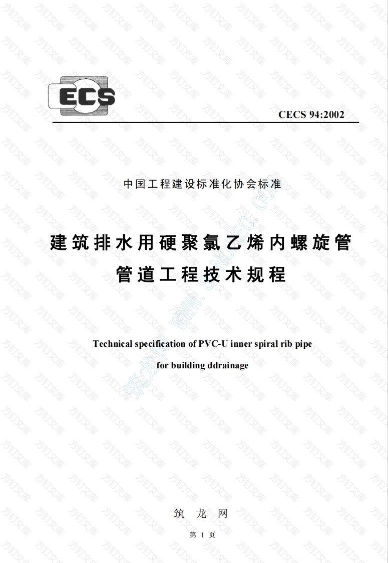 文方方方方方方方文CECS94:2002中国工程建设标准化协会标准建筑排水用硬聚氯乙烯内螺旋管管道工程技术规程Technical specification of PVC-U inner spiral rib pipefor building ddrainage方方订筑龙网文中国工程建设标准化协会标准建筑排水用硬聚氯乙烯内螺旋管管道工程技术规程Technical specification of PVC-U inner spiral rib pipeforbuilding ddrainage文万方ECS94:2002方文万文主编部门:北京市市政工程设计研究总院万批准部门:中国工程建设标准化协会施行日期:2002年9月1日方方万方筑龙万文2002北京前硬聚氯乙烯内螺旋管和旋转进水型管件是九十年代从国外引进的新型排水产品,用于建筑物内作排水立管。因其内壁有与管壁一起成型的三角形螺旋肋可起导流作用,水流沿内壁螺旋状下落时形成通畅的空气柱,显著地降低了立管内的压力波动,提高了排水能力。其配套的三通、四通管件接入口的中线偏向立管中线接入方向的右侧,可使横管排入立管的水流沿管壁的切线方向进入,形成水流旋转,避免了进水水流与立管及立管水流碰撞,降低了管道系统的噪音。为了推广应用这种新型管材,通过总结国内外实践经验,于1997年颁布了《建筑排水用硬聚氯乙烯螺旋管管道工程设计、施工及验次规程》CECS94:97。在几年的实施中,为了适应新的条件,曾于1998和2000年两次对规程进行局部修订。在2001年,生产厂对这种管件的材质和规格再次作了改进,进一步提高了内螺旋管管道系统的排水性能,为此再次修订本规程。根据国家计委计标[1986]1649号文《关于请中国工程建设标准化委员会负责组织推荐性工程建设标准试点工作的通知》,现批准《建筑排水用硬聚氯乙烯内螺旋管管道工程技术规程》,编号为CECS94:2002,推荐给工程建设设计、施工和使用单位采用。本规程由中国工程建设标准化协会管道结构委员归口管理(北京市月坛南街乙2号北京市市政工程设计研究总院,邮编:100045),并负责解释。在使用过程中,如发现需要修改或补充之处,请将意见及有关资料径寄解释单位,主编单位:北京市市政工程设计研究总院参编单位:中国航天建筑设计研究院中国沈阳平和实业有限公司主要起草人:潘家多李桂芬徐志通李玉珊李国源万万文万文