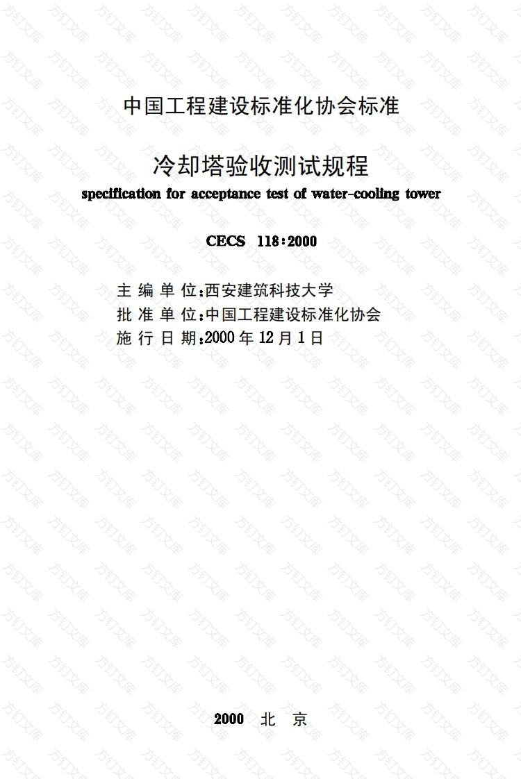 中国工程建设标准化协会标准文冷却塔验收测试规程towerCECS118:2000方主编单位:西安建筑科技大学批准单位:中国工程建设标准化协会施行日期:2000年12月1日方方订万2000北京前言根据中国工程建设标准化协会(92)建标协字第14号《关于下达推荐性工程建设标准规范计划的通知》的要求,制订本规程。现批准协会标准《冷却塔验收测试规程》,编号为CES118:2000,推荐给工程建设设计、制造及施工单位采用。本规程由中国工程建设标准化协会工业给水排水委员会归口管理,由西安建筑科技大学(西安市雁塔路13号,邮编710055)负责解释。在使用中如发现需要修改和补充之处,请将意见和资料径寄解释单位。主编单位:西安建筑科技大学参编单位:国家电力公司东北电力设计院国家电力公司热工研究院机械工业部第四设计研究院主要起草人:王大哲、李志悌、史佑吉、傅敬远方中国工程建设标准化协会2000年9月20日万文次方总则(1)2术语、符号2.1术语(22.2符号(3)3测试前准备(6)4测试大纲(8)5测试条件和要求(9)6测试仪表和测量方法…(13)6.1环境风速和风向测量…(13)6.2环境空气干湿球温度测量(13)6.3大气压测量(13)6.4进塔空气干湿球温度测量…(14)6.5进塔水流量测量…(15)6.6进塔水温测量(16)6.7出塔水温测量…(16)6.8进塔空气流量测量…(17)6.9补充和排污水流量和水温测量(18)6.10出塔空气千湿球温度测量(19)6.11淋水密度及冷却后水温分布测量(19)6.12塔内风速分布测量(19)6.13塔内各部分阻力及风机全压测量(20)6.14风机轴功率测量(20)6.15其它参数测量(20)7测试数据处理…(22)8测试结果评价(29)