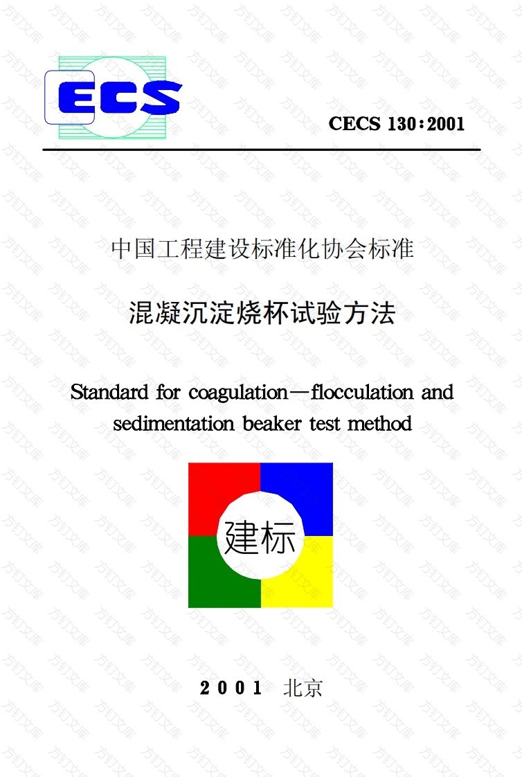 方ECS方方文CECS130:2001中国工程建设标准化协会标准万混凝沉淀烧杯试验方法Standard for coagulation-flocculationandsedimentation beaker test method方方建标北京万中国工程建设标准化协会标准混凝沉淀烧杯试验方法Standard for coagulationtlocculation andsedimentationbeaker test methodCECS130:2001主编单位:山东建筑工程学院批准单位:中国工程建设标准化协会施行日期:2002年1月1日万万方万2001北文言根据中国工程建设标准化协会(97)建标协字第16号文《关于下达1997年第二批推荐性标准编制计划的函》的要求,制订本规程。对混凝沉淀过程的研究和控制有混凝沉淀烧杯试验法、电泳和流动电流检测法、胶体滴定法、颗粒分析法、电镜法和X衍射法等。其中混凝沉淀烧杯试验法应用最普遍,它是一种模拟混合、絮凝和沉淀3个工艺的实验手段。本标准是在总结国内外大量混凝沉淀烧杯试验研究成果和生产实践经验的基础上,参照国内外有关技术文献,并广泛征求全国有关科研、生产和管理单位的意见后制定的。现批准协会标准《混凝沉淀烧杯试验方法》,编号为CECS130:2001,推荐给排水工程建设设计、施工、使用单位采用。本规程由中国工程建设标准化协会城市给水排水委员会归口管理,由山东建筑工程学院(济南市和平路47号,邮编:250014)负责解释。在使用中,如发现需要修改或补充之处,请将意见和资料径寄解释单位主编单位:山东建筑工程学院参编单位:上海市政工程设计研究院深圳中润水工业技术发展有限公司湖北省潜江市梅宇仪器有限公司河南省新乡市新水水处理有限公司主要起草人:武道吉朱广汉李润生宋诗发赵武张泳石文明中国工程建设标准化协会2001年11月20日