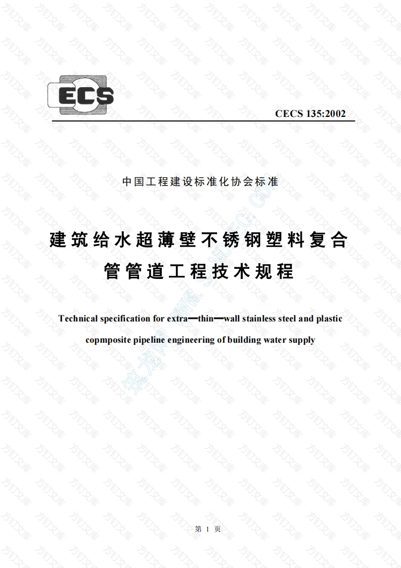 方万文CECS135:2002方中国工程建设标准化协会标准建筑给水超薄壁不锈钢塑料复合管管道工程技术规程Technical specification for extra--thin-wall stainless steel and plasticcopmposite pipeline engineering of building water supply方方方订方方文第1页万文中国工程建设标准化协会标准建筑给水超薄壁不锈钢塑料复合管管道工程技术规程Technical specification for extra-thin-wall stainless steel and plasticcopmposite pipeline engineering of building water supply文CECS135:2002方方订万文主编部门:中国建筑设计研究院批准部门:中国工程建设标准化协会施行日期:2002年10月1日方订方方万文方订2002北京2前根据中国工程建设标准化协会(2001)建标协字第10号《关于印发中国工程建设标准化协会2001年第一批标准制、修订项目计划的通知》的要求,制订本规程。超薄壁不锈钢塑料复合管是我国于1997年首先开发的新型管材,外层为超薄壁不锈钢,内层为塑料,并用热熔胶或特种胶粘剂将两者紧密结合在一起,使其同时具有金属管与塑料管的综合优点。它不但具有质轻、外形美观、施工安装方便等特点,还具有表面强度高、阻力小、整体刚性好、耐腐蚀、卫生性能好、隔热保温性能优良、线膨胀系数小、耐压高等优越性能,是一种经济、实用、美观的管材。适用于建筑冷热水供水、空调供水及工业用水系统。本规程系在总结各地实际应用经验的基础上编制,其内容包括总则、术语、材料、设计、施工及验收等方面。本规程由中国工程建设标准化协会建筑给水排水委员会CECS/TC24归口管理,由广西建筑综合设计研究院(南宁市华东路39号,邮编:530011)负责解释。在使用中如发现需要修改或补充之处,请将意见和资料径寄解释单位。主编单位:广西建筑综合设计研究院参编单位:广州凯通新材料科技有限公司(广州市广园西路231号凯达大厦五楼,邮编:510405)主要起草人:肖睿书、应明康、江明榆、曲申西、吴建武中国工程建设标准化协会2002年8月20日万3文
