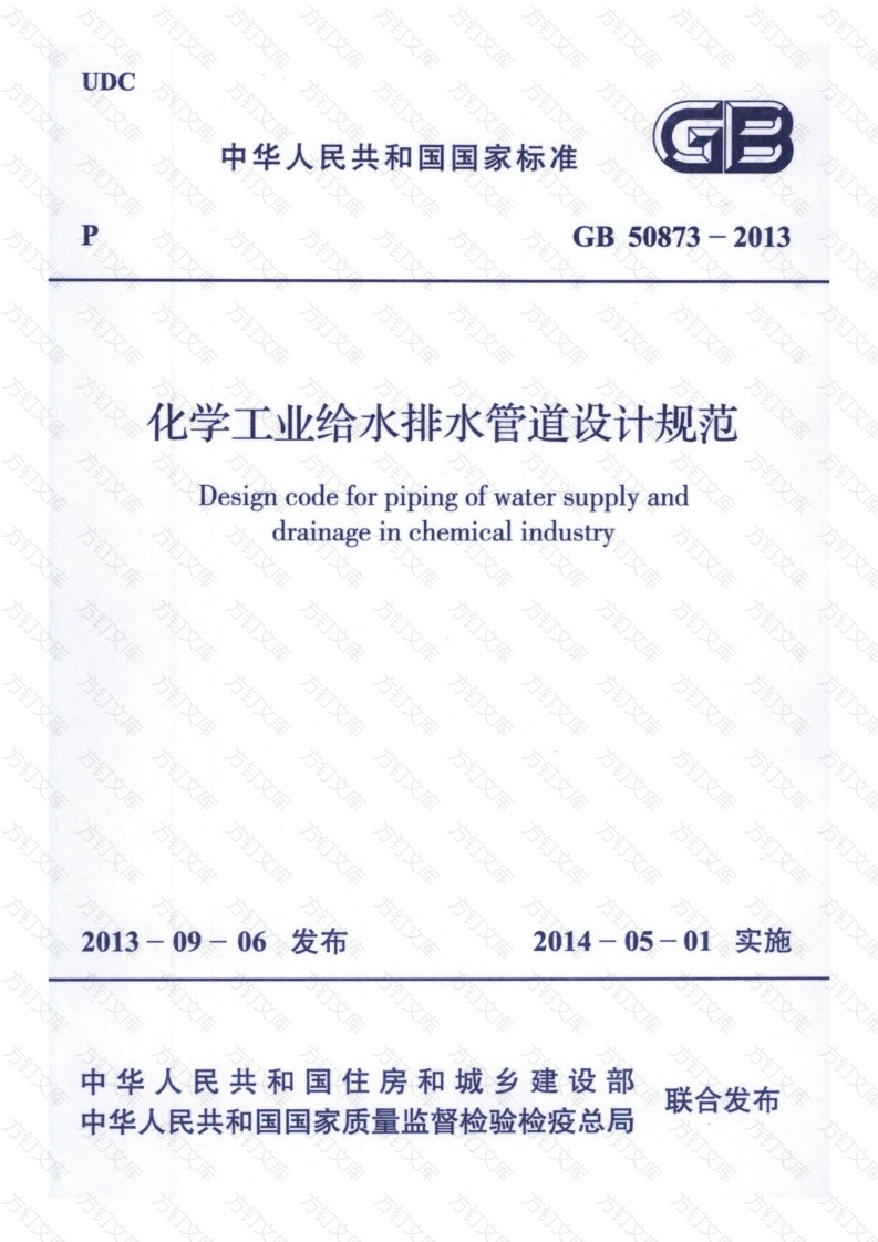 UDC文中华人民共和国国家标准PGB50873-2013万文文万文化学工业给水排水管道设计规范Design code for piping of water supplyanddrainage in chemical industry方方订文2013-09-06发布2014-05-01实施中华人民共和国住房和城乡建设部联合发布中华人民共和国国家质量监督检验检疫总局中华人民共和国国家标准化学工业给水排水管道设计规范Design code for piping of water supply anddrainage in chemical industryGB50873-2013主编部门:中国工程建设标准化协会化工分会批准部门:中华人民共和国住房和城乡建设部施行日期:20年5月日方方方万文方文万文中国计划出版社2013京方方方方方方万中华人心共和国国家标谁化学工业给水排水管道设计规范(B508732013万☆中国计划出版补出版网址:www.jhpress.com地址:北京市西城区木郴地北里甲11号国宏大度C座3层邮政编码:100038电话:(010)63906433(发行部)新华书出北京发行所发文河富华印制包装有限公司印制万文850mm×1168mm1·322印张49千字2014年3月第1版2011年3月第1次印制☆统1580242・164方文定价:12.00元版权所有侵权必究侵权举报电话:(010)6390640万