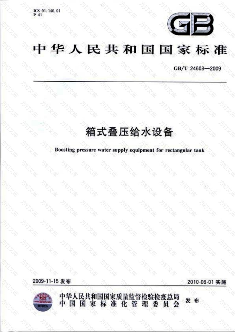 1S91.140.01方文中华人民共和国国家标准GB/T24603-2009箱式叠压给水设备Boosting pressure water supply equipmentforrectangular tank方万方2009-11-15发布2010-06-01实施中华人民共和国国家质量监督检验检疫总局中国国家标准化管理委员会发布方方GB/T24603-2009方文目次文2规范性引用文件文术语和定义…4分类与型号2528附录A(资料性附录)设备组成文方订《方方方方GB/T24603-2009万前言方文本标准由中华人民共和国住房和城乡建设部提出。本标准由住房和城乡建设部给情木产品标准化技术委员全归口万文文T,仿钉,方位库文明文,文文钉文钉