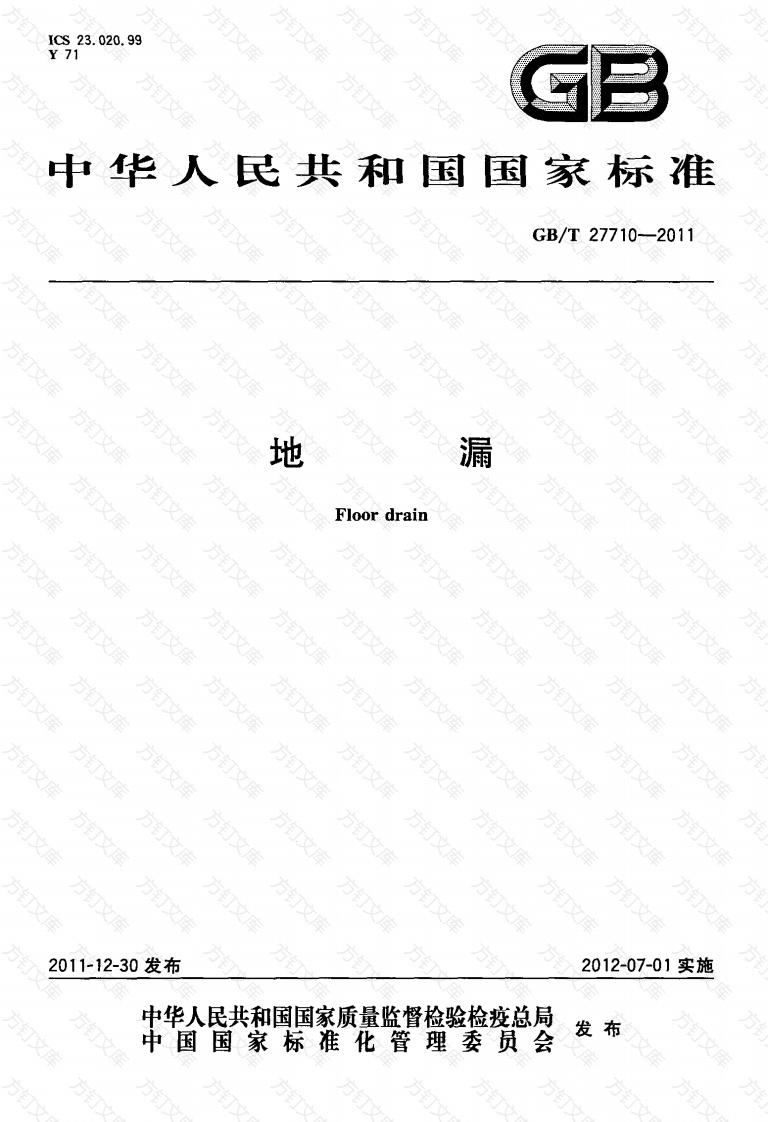 ICs23.020.99Y71中华人民共和国国家标准GB/T27710-2011钉文钉钉库地漏Floor drain方订2011-12-30发布2012-07-01实施中华人民共和国国家质量监督检验检疫总局中国国家标准化管理委员会发布文文方GB/T27710-2011前言文本标准按照GB/T1.1一2009给出的规则起草。文本文件的某些内容可能涉及专利。本文件的发布机构不承担识别这些专利的责任。本标准由中国轻工联合会提出。本标准由全国五金制品标准化技术委员会厨卫五金分技术委员会(SAC/TC174/SC4)归口。本标准起草单位:九牧集团有限公司、福建省水暖消防产品质量监督检验中心、菲时特集团股份有限公司、宁波埃美柯铜阀门有限公司、辉煌水暖集团有限公司、浙江伟星新型建材股份有限公司、北京润德鸿图科技发展有限公司、金凯达五金实业有限公司,本标准主要起草人:林幸发、孙亚瑜、陈建新、赵阳、郑雪珍、林补生、裴俊、周扬、李润凡、许建平、谢晓军。钉方订万文方GB/T27710一2011地漏范围方文本标准规定了地漏的术语和定义、分类、材料、要求、试验方法、检验规则及标志、包装、储运。本标准适用于工业和民用的建筑物使用的地漏本标准不适用于特殊场所,如人防工程等使用的专用地漏。2规范性引用文件下列文件对于本文件的应用是必不可少的。凡是注日期的引用文件,仅注日期的版本适用于本文件。凡是不注日期的引用文件,其最新版本(包括所有的修改单)适用于本文件。GB1176铸造铜合金技术条件GB/T2828.1计数抽样检验程序第1部分:按接收质量限(AQL)检索的逐批检验抽样计划GB/T2829周期检验计数抽样程序及表(适用于对过程稳定性的检验)GB/T5270一2005金属基体上的金属覆盖层电沉积和化学沉积层!附着强度试验方法评述GB/T6461一2002金属基体上金属和其他无机覆盖层经腐蚀试验后的试样和试件的评级GB/T7306.155密封管螺纹第1部分:圆柱内螺纹与圆锥外螺纹GB/T7306.255°密封管螺纹第2部分:圆锥内螺纹与圆锥外螺纹GB/T730755°非密封管螺纹GB/T9286一1998色漆和清漆漆膜的划格试验GB/T10125-1997人造气氛腐蚀试验盐募试验万GB/T12600金属覆盖层塑料上镍+铬电镀层GB/T1271660°密封管螺纹HG/T3091橡胶密封件给、排水管及污水管道用接口密封圈材料规范HG/T3097110℃以下热水输送管橡胶密封圈材料规范术语和定义下列术语和定义适用于本文件。3.1方地漏floor drain接纳并传输地面积水至排水系统的装置。3.2地漏算子grate of floor drain表面带有格栅的作为地漏进水的盖面。3.3地漏盖板cover of floor drain表面没有孔隙的盖面,是密闭式地漏的部件之万