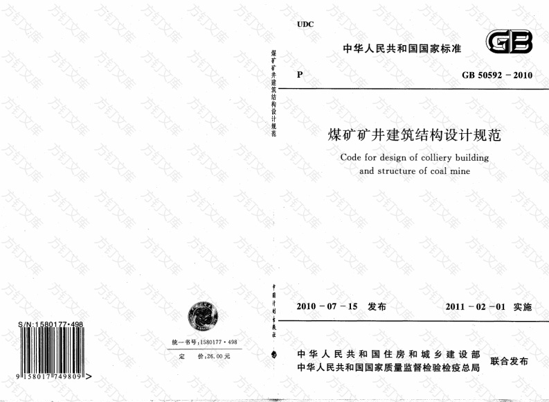 中华人民共和国国家标准、UDC,文GB50592-2010建筑结构计规范·煤矿矿井建筑结构设计规范方Code for design of colliery buildingand structure of coal mine·万万2010-07-15发布2011-02-01实施统一书号:1580177·498定价:26.00元中华人民共和国住房和城乡建设部中华人民共和国国家质量监督检验检疫总局联合发布方文碎、、、中华人民共和国国家标准煤矿矿井建筑结构设计规范文、·Code for design of colliery building文文一and structure of coal mineGB50592-2010文,主编部门:中国煤炭建设协会批准部门:中华人民共和国住房和城乡建设部施行日期:2011年2月1日万必国计划出版社2011北方中华人民共和国住房和城乡建设部公告第680号关于发布国家标准方、文《煤矿矿井建筑结构设计规范》的公告现批准《煤矿矿井建筑结构设计规范》为国家标准,编号为GB50592一2010,自2011年2月1日起实施。其中,第1.0.4、中华人民共和国国家标准3.3.2、3.3.3(2.5)、3.5.3(6)、6.4.1条(款)为强制性条文,必煤矿矿井建筑结构设计规范·须严格执行。GB50592-2010本规范由我部标准定额研究所组织中国计划出版社出版发电话,6390643163906381)新华书店北京发行断发行850×1168毫米1/32108千字书号:1580177·498定价:26.00元,、、中华人民共和国住房和城乡建设部、,万