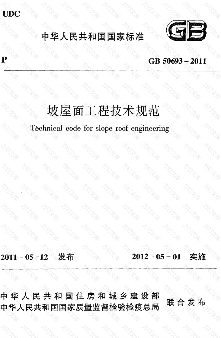 UDC中华人民共和国国家标准GB50693-2011坡屋面工程技术规范2011-05-12发布方2012-05-01实施中华人民共和国住房和城乡建设部中华人民共和国国家质量监督检验检疫总局联合发布中华人民共和国国家标准万坡屋面工程技术规范Technical code for slope roof engineeringGB50693-2011文主编部门:中华人民共和国住房和城乡建设部批准部门:中华人民共和国住房和城乡建设部实施日期:2012年5月1日方方方方方万文万中国建筑工业出版社2011北方万方万文文中华人民共和国国家标准坡屋面工程技术规范Technical code for slope roofengineeringGB50693-2011中国建筑工业出版社出版、发行(北京西郊白力庄)各地新华书店、建筑书店经销北京红光制版公司制版北京同文印刷有限责任公司印刷本850×1168毫米1/32印张:4/112千字2011年11月第一版2012年5月第三次印刷定价:21.00元统一书号:15112,21098版权所有翻印必究如有印装质量问题,可寄本社退换(邮政编码100037)本社网址:http:/www.cabp.com.cn网上书店:http:/www.china-building.com.cn