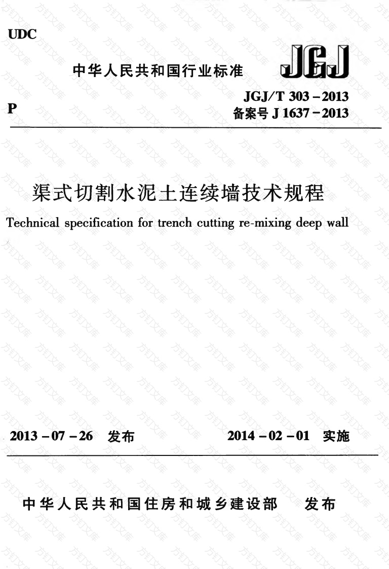 UDC中华人民共和国行业标准万文JGJ/T303-2013P备案号J1637-2013渠式切割水泥土连续墙技术规程Technical specification for trench cutting re-mixing deep wall仿钉仿钉钉2013-07-26发布2014-02-01实施中华人民共和国住房和城乡建设部发布方中华人民共和国行业标准渠式切割水泥土连续墙技术规程echnical specification for trench cutting re-mixing deepJGJ/T303-2013批准部门:中华人民共和国住房和城乡建设部施行日期:2014年2月、1日方订方万万中国建筑工业出版社2013北京万方订中华人民共和国行业标准渠式切割水泥土连续墙技术规程echnical specification for trench cutting re-mixingdeepwallJGJ/T303-2013中国建筑工业出版社出版、发行(北京西郊百万庄各地新华书店、建筑书店经销北京红光制版公司制版廊坊市海涛印刷有限公司印刷开本:850×1168毫米1/32印张:2%字数:55千字2013年12月第版2013年12月第一次印刷定价:11.00元统一书号:15112·23762版权所有翻印必究如有印装质量问题,可寄本社退换(邮政编码100037)本杜网址:htp:/www.cabp.com.cn网上书店:http:/www.china-building.com.cn