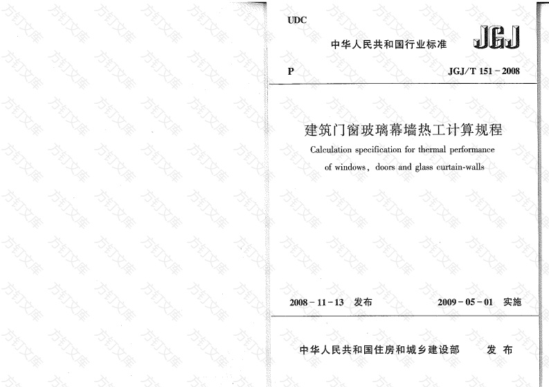 方UDC中华人民共和国行业标准JGJ/T151-2008文建筑门窗玻璃幕墙热工计算规程文Calculation specification for thermal performanceof windows,doors and glass curtain-walls文2008-11-13发布2009-05-01实施中华人民共和国住房和城乡建设部发布方中华人民共和国行业标准建筑门窗玻璃幕墙热工计算规程JGJ/T151-2008方J828-2008方)批准部门:中华人民共和国住房和城乡建设部”施行日期:2009年5月1日方·中国建筑工业出版社2008北方方中华人民共和国住房和城乡建设部公告第143号万关于发布行业标准《建筑门窗玻璃中华人民共和国行业标准V建筑门窗玻璃幕墙热工计算规程幕墙热工计算规程》的公告doors and glass curtain-walls现批准《建筑门窗玻璃幕墙热工计算规程》为行业标准,编号为JG)/T151-2008,自2009年5月1日起实范本规程由我部标准定额研究所组织中国建筑工业出版社出版发行各地新华书店,建筑书店经情中华人民共和回住房和城乡建设部2008年11月13日统一书号,15112·16756版权所有印必究如有印装质最问愿,可寄本社退换本社网址:http:/www.cabp.com.cn方·
