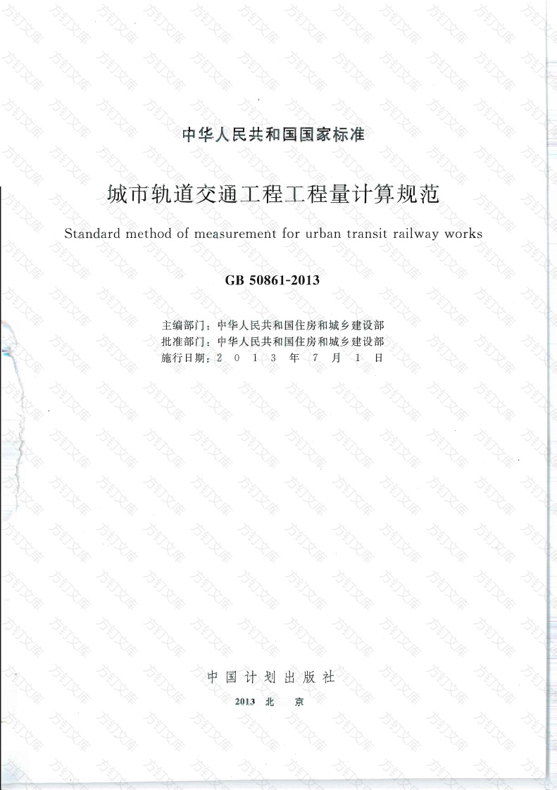 T方中华人民共和国国家标准方城市轨道交通工程工程量计算规范Standard method of measurementfor urban transit railwayworksGB50861-2013主编部门:中华人民共和国住房和城乡建设部批准部门:中华人民共和国住房和城乡建设部施行日期:2013年7月1日方,万中国计划出版社2013京万文方,万中华人民共和国国家标准城市轨道交通工程工程量计算规范GB50861-2013方方订文中国计划出版社出版地址:北京市西城区木辉地北里甲11号国宏大厦C座4层邮致编码:100038电话,(010)63906433(发行部)新华书店北京发行所发行三河富华印刷包装有限公司印刷880mmX×1230mm1/168.5印张250千字2013年4月第1版2013年4月第1次印刷万方统一书号:1580242·008定价:70.00元侵权举报电话:(010)63906404如有印装质量问题,请寄本杜出版部调换中华人民共和国住房和城乡建设部公告第1573号住房城乡建设部关于发布国家标准万文《城市轨道交通工程工程量计算规范》的公告现批准《城市轨道交通工程工程量计算规范》为国家标准,编号为GB508612013,自2013年7月1日起实施。其中,第1.0.3、4.2.1、4.2.2、4.2.3、4.2.4、4.2.5、4.2.6、4.3.1条(款)为强制性条文,必须严格执行。本规范由我部标准定额研究所组织中国计划出版社出版发行。中华人民共和国住房和城乡建设部方2012年12月25日方万文文