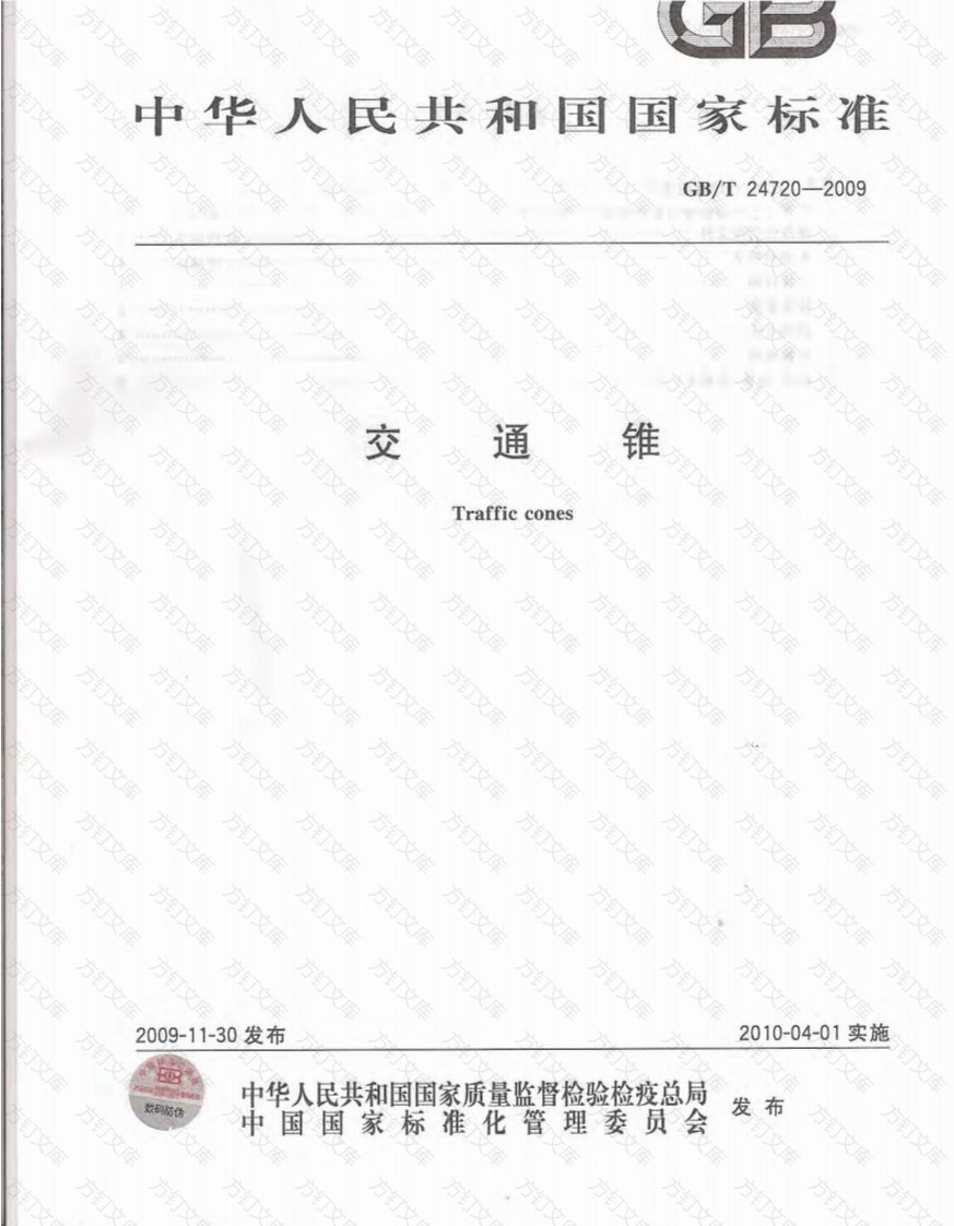 中华人民共和国国家标准钉GB/T24720-2009文仪库库钉文交通锥钉Traffic cones万文2009-11-30发布2010-04-01实施中华人民共和国国家质量监督检验检疫总局中国国家标准化管理委员会发布方GB/T24720-2009方裤方万前言12、规范性引用文件方术语和定义产品分类技术要求检验规则8标志、包装、运输和贮存钉钉、文父文万方方GB/T24720一2009万前言万文本标准由全国交通工程设施(公路)标准化技术委员会(SAC/TC223)提出并归口,本标准负责起草单位:交通部公路科学研究院、国家交通安全设施质量监督检验中心。本标准参加起草单位:北京中交华安科技有限公司。本标准主要起草人:苏文英、李丹、王蕊、王玮、马骏。钉文钉文“库、文文万