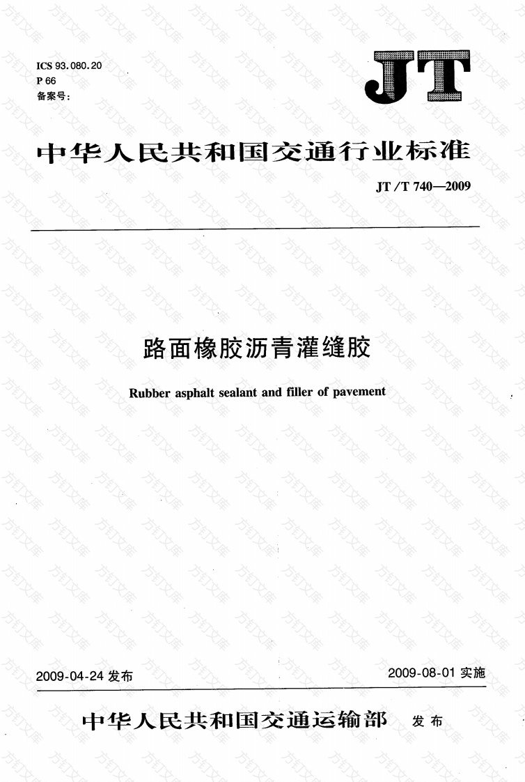 ICS93.080.20P66方方备案号:中华人民共和国交通行业标准JT/T740一2009方万文路面橡胶沥青灌缝胶方订Rubber asphalt sealant and filler of pavement库,·,钉2009-04-24发布2009-08-01实施中华人民共和国交通运输部发布方JT/T740-2009次前言1范围2规范性引用文件3术语和定义4技术要求5试验方法6检验规则67标志、包装、运输和储存附录A(规范性附录)灌缝胶低温拉伸试验用水泥混凝土块制作方法和要求库库钉方、,、文文。钉方方JT/T740-2009前言文本标准的附录A是规范性附录。本标准由交通部公路科学研究院提出。本标准由交通部公路司归口。本标准起草单位:交通部公路科学研究院、河南百和国际公路科技有限公司、河南省高速公路实业开发公司、河南高速公路发展有限责任公司。本标准主要起草人:徐剑、李峰、黄颂昌、秦永春、梁嵩巍、辛伟、李博、王炳强、芦玉江、李平、张占军。方文座,方丁“方文