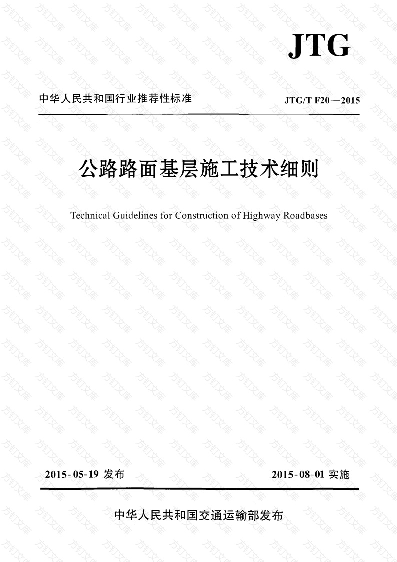 文JTG中华人民共和国行业推荐性标准JTG/T F20-2015公路路面基层施工技术细则Technical Guidelines for Construction of Highway Roadbases订方方方订方订方方订万文2015-05-19发布2015-08-01实施中华人民共和国交通运输部发布文中华人民共和国行业推荐性标准万文公路路面基层施工技术细则方Technical Guidelines for Construction of HighwayRoadbasesJTG/TF20-2015万文主编单位:交通运输部公路科学研究院批准部门:中华人民共和国交通运输部实施日期:2015年08月01日方万文方万文方方方方方图书在版编目(CP)数据公路路面基层施工技术细则F202015交通运输部公路科学研究院主编北京民交通出版社股份有限公司,2015.71SBN978-7-114-12367-2I①公…Ⅱ.①交…①路面基层道路工程工程施工一技术规范1V.①U416.2-65中国版本图书馆CIP数据核字(2015)第134419号万万文标准类型:中华人民共和国行业推荐性标准标准名称:公路路面基层施工技术细则标准编号:JTG/TF20-2015主编单位:交通运输部公路科学研究院责任编辑:吴有铭李农出版发行:人民交通出版社股份有限公司地址:(100011)北京市潮阳区安定门外外馆斜街3号址:htp:/ww.ccpres.com.cn销售电话:(010)59757973总经销:人民交通出版社股份有限公司发行部经销:各地新华书店印北京市密东印刷有限公司方开本:880×12301/16印张:5.5字数:124千版次:2015年7月第1版印次:2015年7月第1次印刷书号:1sBN978-7-114-12367-2定价:45.00元(有印刷、装订质量问题的图书,由本公司负责调换)