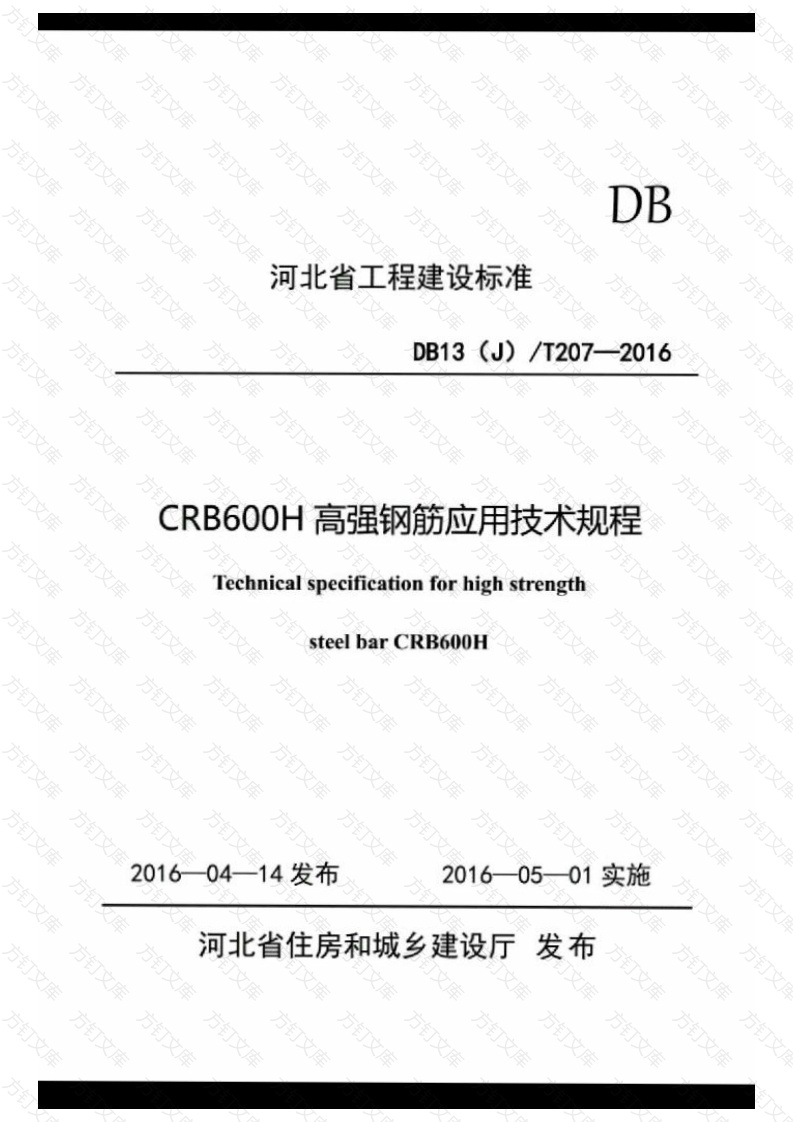 方方DB方文方订河北省工程建设标准DB13 (J)/T207-2016文CRB600H高强钢筋应用技术规程Technical specification for high strengthsteel bar CRB600H库万方万201604一14发布2016—0501实施河北省住房和城乡建设厅发布文文方方订方河北省工程建设标准万文CRB600H高强钢筋应用技术规程Technical specification for high strength万文steel bar CRB600H钉DB13(J)/T207—2016万主编单位:河北建筑设计研究院有限责任公司批准部门:河北省住房和城乡建设厅施行日期:2016年5月1日库钉文2016北京方方方河北省工程建设标准CRB6OOH高强钢筋应用技术规程Technical specification for high strengthsteel bar CRB600HDB13(J)/T207一2016方中国建材工业出版社出版(北京市西城区车公庄大街6号)万石家庄市红旗印刷厂印刷万开本:850mm×1168mm1/32印张:1.75字数:35千字2016年4月第一版2016年4月第一次印刷印数:1500月定价:25.00元库方统一书号:155160·730