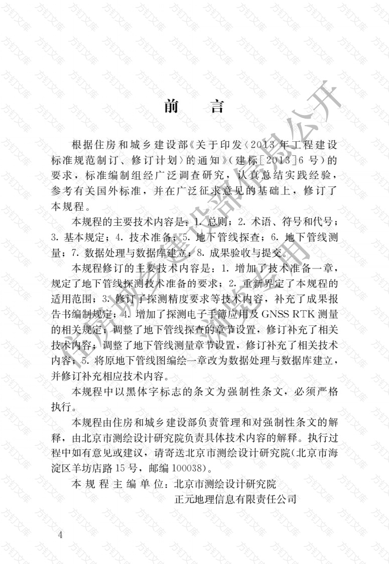方方前言根据住房和城乡建设部《关于印发〈203年工程建设标准规范制订、修订计划〉的通知》(建标[2013]6号)的要求,标准编制组经广泛调查研究,认真总结实践经验,参考有关国外标准,并在广泛征求意见的基础上,修订了本规程。本规程的主要技术内容是:1总则;2.术语、符号和代号;3.技术准备5.地下管线探查;6.地下管线测量;7.数据处理与数据库建立;8.成果验收与提交。本规程修订的主要技术内容是:1.增加了技术准备一章规定了地下管线探测技术准备的要求;2.重新界定了本规程的适用范围;3。修订了探测精度要求等技术内容,补充了成果报告书编制规定:4.增加了探测电子手簿应用及GNSS RTK测量的相关规定,调整了地下管线探查的章节设置,修订补充了相关技术内容;调整了地下管线测量章节设置,修订补充了相关技术内容:.将原地下管线图编绘一章改为数据处理与数据库建立,并修订补充相应技术内容。本规程中以黑体字标志的条文为强制性条文,必须严格执行。本规程由住房和城乡建设部负责管理和对强制性条文的解释,由北京市测绘设计研究院负责具体技术内容的解释。执行过程中如有意见或建议,请寄送北京市测绘设计研究院(北京市海淀区羊坊店路15号,邮编100038)本规程主编单位:北京市测绘设计研究院正元地理信息有限责任公司本规程参编单位:中国城市规划协会地下管线专业委员会州市城市规划勘测设计研究院厦门精图信息技术有限公司中地数码集团福建省地质测绘院国家测绘地理信息局地下管线勘测工程院保定金迪地下管线探测工程有限公司上海岩士江程勘察设计研究院有限西安煤航信息产业有限公司北京市勘察设计研究院有限公司建设综合勘察研究设计院有限公司南京市测绘勘察研究院股份有限公司住房城河北九华勘查测绘有限责任公司河南省地球物理工程勘察院河南省地质矿产勘查开发局测绘地理信息院沈阳地球物理勘察院武汉科岛地理信息工程有限公司东省地质勘探工程勘察院深圳市市政设计研究院有限公司山东正元地球物理信息技术有限公司山东中基地理信息监理有限责任公司州长地工程勘测有限公司中国电波传播研究所深圳市大升高科技工程有限公司沈阳市勘察测绘研究院本规程主要起草人员:陈品祥李学军丘广新林广乔志勇余国宏黄永进陈王晓东张殿江刘国安李凤之李茂阁陈鸿王韩波陈昌彦龚慧斌孔令彦刘志华苑志刚华安中夏金儒刘保生吴献文王春和任志忠巢民强毛坤德本规程主要审查人员:王厚之贻芳刘金光黄北新何陈恒孙毅中同住房城乡建浏览专用方方钉万文