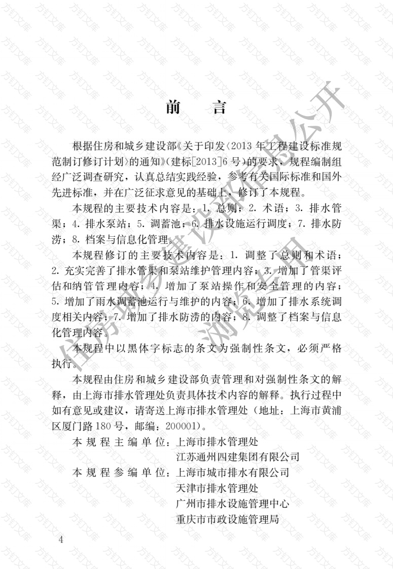 前言根据住房和城乡建设部《关于印发〈2013年工程建设标准规范制订修订计划〉的通知》(建标[2013]6号)的要求,规程编制组经广泛调查研究,认真总结实践经验,参考有关国际标准和国外先进标准,并在广泛征求意见的基础上,修订了本规程。2.术语;3.排水管渠;4.排水泵站;5.调蓄池,6排水设施运行调度;7.排水防涝;8.档案与信息化管理,本规程修订的主要技术内容是:1.调整了总则和术语:2.充实完善了排水管渠和泵站维护管理内容;:3增加了管渠评估和纳管管理内容;4,增加了泵站操作和安全管理的内容;5.增加了雨水调蓄池运行与维护的内容;众,增加了排水系统调度相关内容7.增加了排水防涝的内容;8,调整了档案与信息化管理内容本规程中以黑体字标志的条文为强制性条文,必须严格执行本规程由住房和城乡建设部负责管理和对强制性条文的解释,由上海市排水管理处负责具体技术内容的解释。执行过程中如有意见或建议,请寄送上海市排水管理处(地址:上海市黄浦区厦门路180号,邮编:200001)本规程主编单位:上海市排水管理处江苏通州四建集团有限公司文本规程参编单位:上海市城市排水有限公司天津市排水管理处广州市排水设施管理中心重庆市市政设施管理局北京城市排水集团有限责任公司南京市排水管理处沈阳市排水管理处西安市市政设施管理局合肥市排水管理办公室武汉市排水泵站管理处哈尔滨排水集团有限责任公司石家庄市排水管理处常州市排水管理处无锡市排水管理处上海誉帆环境科技有限公司江苏兴厦建筑安装有限公司黑旋风工程机械开发有限公司同济大学虹口区市政和水务管理署房城上海乐通管道工程有限公司上海雷迪机械仪器有限公司上海建科检验有限公司上海城市排水系统工程技术研究中心要起草员:唐建国庄敏捷姚杰张杰吴方华王学海唐东齐玉辉杨宏叶永成慈曾福程晓波朱军顾一鸣刘波王非陈忱李佳川梁珊珊马远东邵亚新王兴梅吴向荣赵春生张凯伟杨瑞华王虹李天兵田瑜展云蒋曦王增义姜明洁刘锟苗春池永洲杨栩范翔宇李淑颖贾建英焦启兵江海燕成军魏树弘宋解胜周彤乔才良成张佳宁本规程主要审查人员:杨向平杭世珺俞亮鑫何伶俊毛应酬陈萌张东康林伟国住房城乡建设部信息公陈洪回军周新宇方方订浏览专用方钉方方订万文