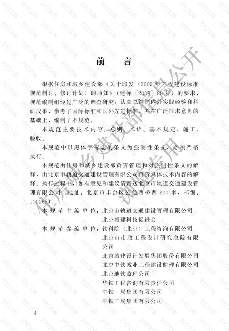 前根据住房和城乡建设部《关于印发2009年无程建设标准规范制订、修订计划)的通知》(建标[2009]88号)的要求,规范编制组经过广泛的调查研究,认真总结国内外实践经验和科研成果,参考了国际标准和国外先进标准,并在广泛征求意见的基础上,编制了本规范本规范主要技术内容:总则、术语、基本规定、施工验收本规范中以黑体字标志的条文为强制性条文,必须严格执行本规范由住房和城乡建设部负责管理和对强制性条文的解释,由北京市轨道交通建设管理有限公司负责具体技术内容的解释。执行过程中,如有意见和建议请寄送北京市轨道交通建设管理有限公司地址:北京市丰台区公益西桥西800米,邮编:00068y本规范主编单位:北京市轨道交通建设管理有限公司北京城建科技促进会本规范参编单位:铁科院(北京)工程咨询有限公司北京市市政工程设计研究总院有限公司北京城建设计发展集团股份有限公司北京中铁诚业工程建设监理有限公司北京地铁监理公司华铁工程咨询有限责任公司中铁一局集团有限公司中铁三局集团有限公司易科路通轨道设备有限公司安境迩上海)科技有限公司本规范主要起草人员:丁树奎韩志伟朱胜利王建明孙宁孙京健任静井恒法刘力黑勇进张丁盛朱勇坚蒋莹郭建平刘林昌郑树成王朝阳李大勇曾向荣孙鑫乔怀峰罗小强杨军李建军周丽艳杨惠喜齐长宁张艳军李克飞王文斌郑玉洁本规范主要审查人员张立国黄红东董国宪林平张晋勋刘富魏周春江万红赵秀丽徐青旺长劭明李忠峰住房城乡高文虎方方方方次总则术语3基本规定3.1般规定3.2工程划分施工4.1般规定4.2施工准备4.3进场验收4.4轨排组装4.5轨排架设及调整文4.6底座施工4.7成品保护9验收…10文般规定105.2轨排组装115.3轨排架设及调整125.4底座施工135.5轨道整理15附录A梯形轨枕轨道工程施工工艺流程17附录B验收记录表格19本规范用词说明27引用标准名录28文