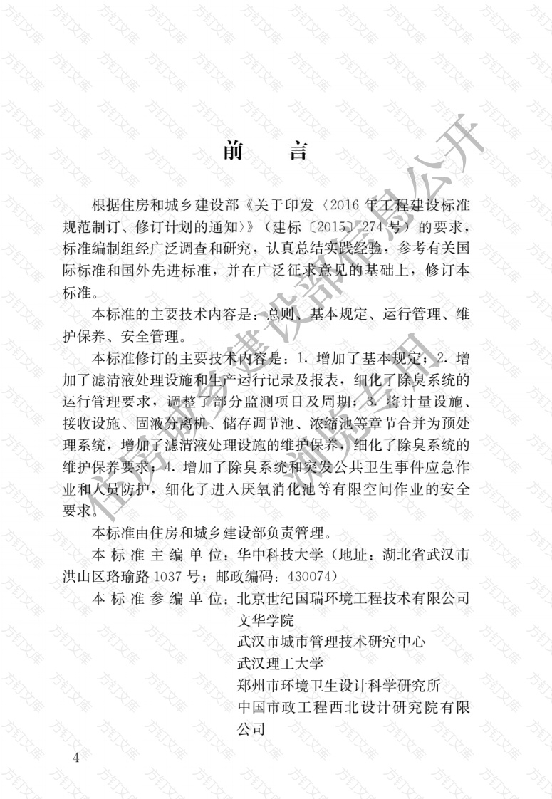 方万文根据住房和城乡建设部《关于印发〈2016年程建设标准规范制订、修订计划的通知〉》(建标〔2015)274号)的要求,标准编制组经广泛调查和研究,认真,总结实践经验,参考有关国际标准和国外先进标准,并在广泛征求意见的基础上,修订本本标准的主要技术内容是:总则基本规定、运行管理、维护保养、安全管理。本标准修订的主要技术内容是:1.增加了基本规定2.增加了滤清液处理设施和生产运行记录及报表,细化了除臭系统的运行管理要求,调整了部分监测项日及周期;3,将计量设施接收设施、固液分离机、储存调节池、浓缩池等章节合并为预处理系统,增加了滤清液处理设施的维护保养,细化了除臭系统的维护保养要求;4.增加了除臭系统和突发公共卫生事件应急作业和人员防护,细化了进入厌氧消化池等有限空间作业的安全要求。本标准由住房和城乡建设部负责管理本标准主编单位:华中科技大学(地址:湖北省武汉市洪山区珞瑜路1037号;邮政编码:430074)本标准参编单位:北京世纪国瑞环境工程技术有限公司文华学院武汉市城市管理技术研究中心文武汉理工大学郑州市环境卫生设计科学研究所中国市政工程西北设计研究院有限公司文中兰环保科技股份有限公司青岛市固体废弃物处置有限责任公司武汉晨土环保科技有限公司本标准主要起草人员:陈朱琦廖朱玮王绍康罗杨列潘四红裴照堂王福浩祁昌伟廖茂彬何晓曼荆涛曹丽李国梁占美丽杨林侯鹏飞王启亮张均龙张婷婷赵蒙蒙董仁君杜雨升詹坤罗春光罗梦伊朱静怡蔡伽怡术子佳靓曾泽华王思淇何凌志姜旺吴艺本标准主要吴文伟张范刘谢文刚史所龙陈同斌苏昭辉住房城乡晟方方订方方方方方万文总则2基本规定3运行管理3.1般规定3.2计量设施3.3接收设施3.4固液分离机3.5储存调节池与浓缩池3.6絮凝脱水设备3.7厌氧消化池及附属设施3.8滤清液处理设施83.983.10粪泥和消化污泥处理设施9除臭系统103.12控制室3.13检测与监测113.14生产运行记录13维护保养…154.1般规定154.2预处理系统154.3絮凝脱水设备1616T4.4厌氧消化池及附属设施4.5滤清液处理设施184.6加氯消毒设施184.7粪泥和消化污泥处理设施196