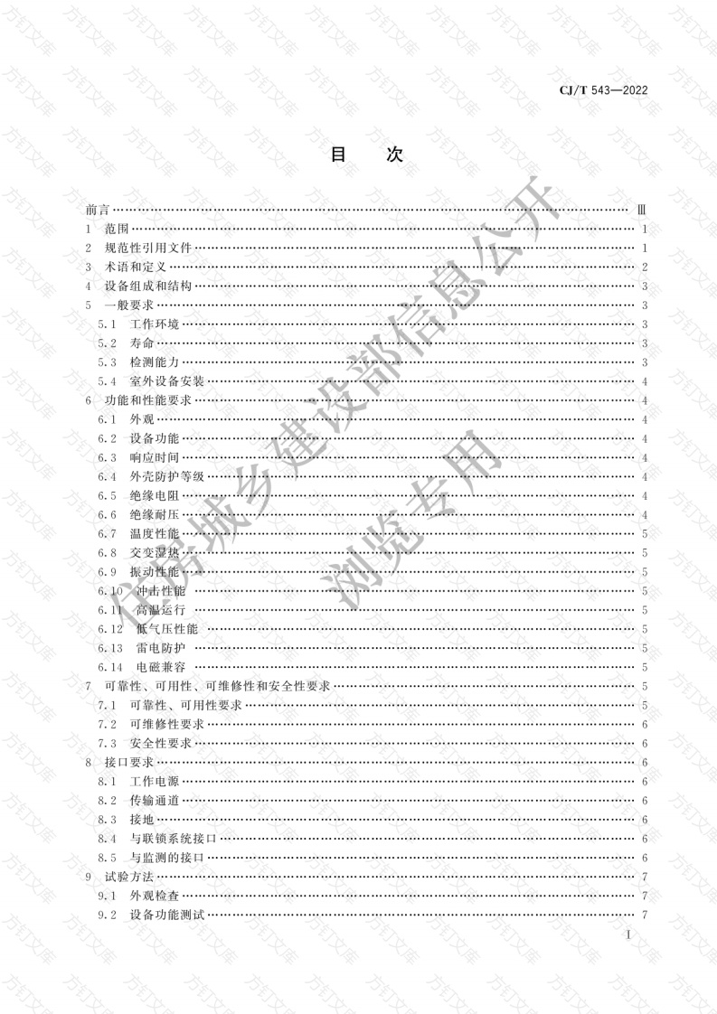 万万方CJ/T543-2022目次文前言12规范性引用文件4设备组成和结构3一般要求…5.1工作环境35.2寿命…5.3检测能力5.4室外设备安装6功能和性能要求6.1外观…6.2设备功能36响应时间外壳防护等级6.5绝缘电阻6.6绝缘耐压6.7温度性能6.8交变湿热56.9振动性能56.10冲击性能56.11高温运行6.12低气压性能6.13雷电防护6.14电磁兼容可靠性、可用性、可维修性和安全性要求57.1可靠性、可用性要求…7.2可维修性要求…7.3安全性要求8.1工作电源8.2传输通道8.38.4与联锁系统接口8.5与监测的接口9试验方法9.1外观检查9.2设备功能测试CJ/T543-20229.3响应时间测试9.4外壳防护等级试验9.5绝缘电阻…9.6绝缘耐压9.7温度试验…9.8交变湿热试验9.9振动性能试验……99.10冲击性能试验9.11高温运行试验9.12低气压试验99.13雷电防护试验109.14电磁兼容试验1010检验规则…10.1检验分类…1010.2出厂检验…1010.3型式检验…10.4出厂检验及型式检验项目表1011标志、包装、运输和贮存1111.11111.21111.3设备运输1111.4设备贮存…11参考文献12方库文方543-2022本标准按照GB/T1.1一2020《标准化工作导则第1部分:标准化文件的结构和起草规则》的规定起草本标准由住房和城乡建设部标准定额研究所提出。本标准由住房和城乡建设部城市轨道交通标准化技术委员会归本标准起草单位:成都铁路通信设备有限责任公司、北京全路通信信号研究设计院集团有限公司、中铁二院工程集团有限责任公司、成都轨道交通集团有限公司海地铁维护保障有限公司通号分公司。本标准主要起草人:谢玉琼、丁华伟、杨晓东胡树,罗松、高建强、戴宏、张志倜、廖理明、杨金伟、于波、王伟、聂庆华、黄忠礼、孟蓓谢研丽、黄道藏住房城乡建设浏览专用方万钉钉方万文方方