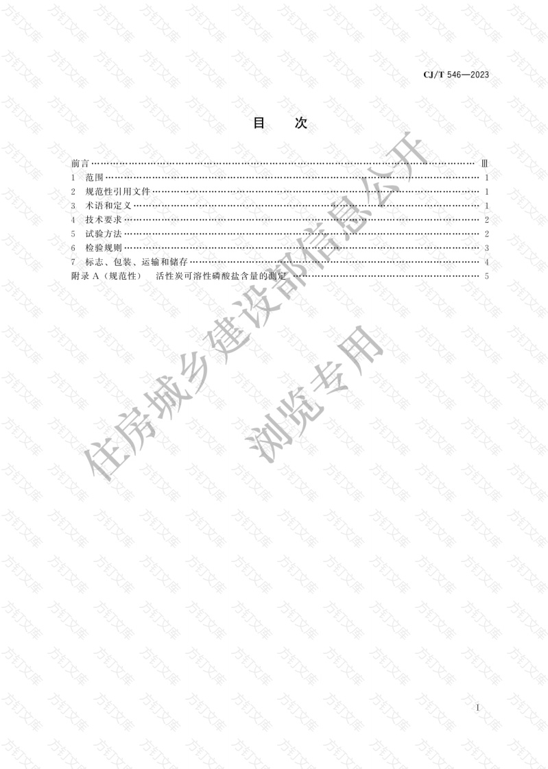 C/T546-2023万前言…1范围…2规范性引用文件3术语和定义……4技术要求2526检验规则…7标志、包装、运输和储存附录A(规范性)浏览专用方方方万文浏览专用文万文文方文方CJ/T546-2023本文件按照GB/T1.1一2020《标准化工作导则第1部分:标准化件的结构和起草规则”的规定起草本文件由住房和城乡建设部标准定额研究所提出,本文件由住房和城乡建设部市容环境卫生标准化技术委员会归本文件起草单位:中国城市建设研究院有限公司、中城院(北京环境科技股份有限公司、大同市云光活性炭有限责任公司、南平元力活性炭有限公司,浙江大学、浙能锦江环境控股有限公司、徐州天正活性炭厂、北京高能时代环境技术股份有限公司、大同中车煤化有限公司、江苏浦士达环保科技股份有限公司、广东韩研活性炭科技股份有限公司、中国市政华北设计研究总院有限公司、光大环保(中国)有限公司。本文件主要起草人:郭祥信、毕晓东占礼万晓东、屈志云、尹水娥、白彬杰、刘茹飞、林晓青、王武忠、缪存标、史焕明、程振国甄胜利、方朝军、李志武、韩琍君、刘斌、闵海华、傅修军王洪炳波陆胜勇、高波、丁仕文、住房城乡建陈形、黄丹丹、史阳、俞晓阳、何磊陈雨、韩初榆浏览专用万方万