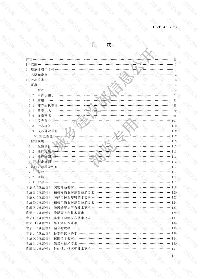 方万文C/T547-2023次前言范围规范性引用文件……3术语和定义4产品分类…5要求5.1衬衣5.2单裤、裙子215.3常服315.4茄克式执勤服5.5防寒大衣495.6连帽雨衣6反光背心1078产品标签1105.9成品外观质量1125.10安全性能112检验规则1136.1检验项目1136.2抽样方法1136.3113判定规则113包装、运输及贮存1177.1包装1172运输1177.3贮存…117附录A(规范性)实物样品要求118附录B(规范性)精梳棉涤混纺织品技术要求120附录C(规范性)防静电仿毛哔叽技术要求122附录D(规范性)精梳毛涤混纺织品技术要求124附录E(规范性)防风透湿涂层布技术要求127附录F(规范性)涂层雨衣布技术要求129附录G(规范性)防水透湿涂层布技术要求131附录H(规范性)里子绸技术要求133附录】(规范性)粘合衬规格135标志扣技术要求136附录K(规范性)拉链技术要求附录L(规范性)黑炭衬技术要求150附录M(规范性)针刺绒、领底呢技术要求151CJ/T547-2023附录N(规范性)针刺棉芯垫肩技术要求附录O(规范性)平剪绒技术要求155附录P(规范性)超细纤维絮片技术要求156附录Q(规范性)罗纹布技术要求158方文住房城乡建设部信息公于方方订浏览专用方T方方CJ/T547一2023万文本文件按照GB/T1.1一2020《标准化工作导则第1部分:标准化文件的结构和起草规则”的规定起草。请注意本文件的某些内容可能涉及专利。本文件的发布机构不承担识利的贵任本文件由住房和城乡建设部标准定额研究所提出。本文件由住房和城乡建设部市容环境卫生标准化技术委员会归本文件起草单位:际华集团股份有限公司、际华三五零二职业装有限公司、际华三五零六纺织服装有限公司、际华三五三四制衣有限公司、中山市仕春纺织印染实业有限公司、山东南山智尚科技股份有限公司、丹东优耐特纺织品有限公司、吴江市恒润织造天纺标检测认证股份有限公司本文件主要起草人:周育青、温璇、杨彦霞、曹赛宁、钱志敏、慎凯玲、肖炬、夏峰、郭洁丽李博、吕刚、赵胜男、朱晨瑜、陈柔任、张连荣隋卫、刘刚中、张志海、宋宏波、王智清、祝志花、商莹莹、洪子元、刘慧慧、晓住房城乡建浏览专用方方