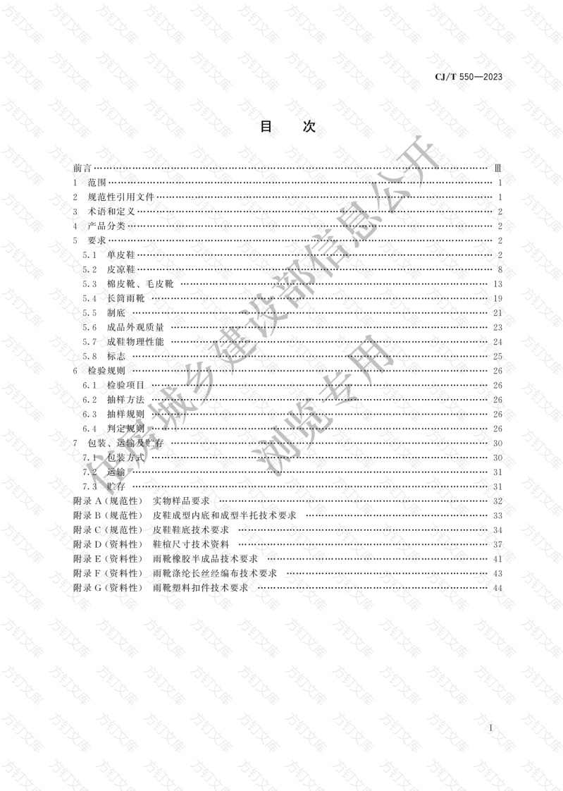 方方万文CJ/T550-2023前言…范围…2规范性引用文件3术语和定义……4产品分类2525.1单皮鞋25.2皮凉鞋5.3棉皮靴、毛皮靴5.4长筒雨靴195.5制底5.6成品外观质量5.7成鞋物理性能5.8标志256检验规则6.1检验项目266.2抽样方法6.3抽样规则6.4判定规侧26包装、运输及贮存07.1包装方式317.3贮存31附录A(规范性)实物样品要求32附录B(规范性)皮鞋成型内底和成型半托技术要求附录C(规范性)皮鞋鞋底技术要求34附录D(资料性)鞋楦尺寸技术资料附录E(资料性)雨靴橡胶半成品技术要求41附录F(资料性)雨靴涤纶长丝经编布技术要求附录G(资料性)雨靴塑料扣件技术要求44方方万文方订万文方万文浏览专用文万文文方文方方CJ/T550--2023万文本文件按照GB/T1.1一2020《标准化工作导则第1部分:标准化文件的结构和起草规则”的规定起草。请注意本文件的某些内容可能涉及专利。本文件的发布机构不承担识利的贵任本文件由住房和城乡建设部标准定额研究所提出。本文件由住房和城乡建设部市容环境卫生标准化技术委员会归口。本文件起草单位:际华集团股份有限公司、际华三五五皮革皮鞋有限公司、际华三五三九制鞋有限公司、安徽中洋皮革科技有限公司、南京东亚高新材料有限公司、天纺标检测认证股份有限公司。本文件主要起草人:周育青、周素静、范连友吴婷、王丽果、邹忌、秦菲菲、王清林、杨春燕、祝志花、葛胜超、邓小华、孙建平、住房城乡建设朱晨瑜、吴佳慧、赵胜男、刘慧慧、刘云军、张晓含浏览专用文方万T