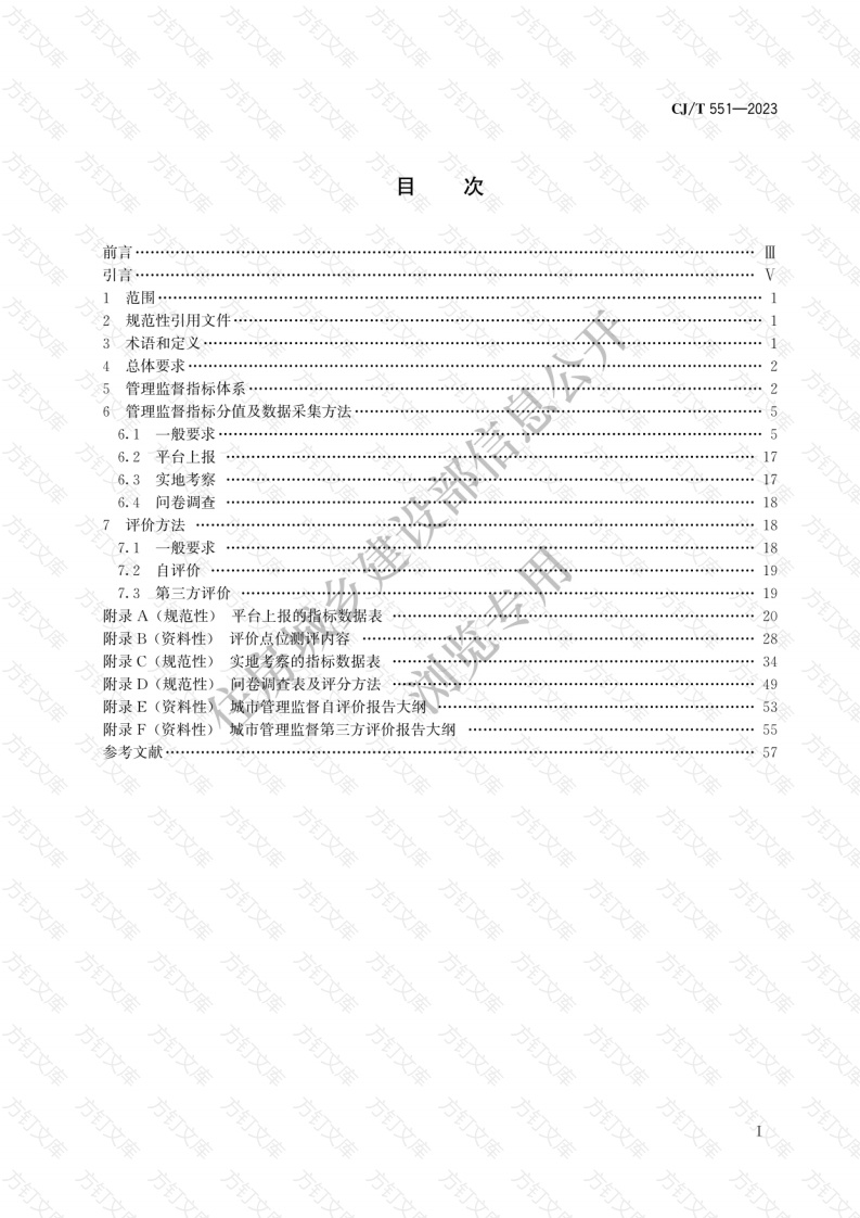 方CJ/T551-2023次前引言范围…2规范性引用文件……3术语和定义25管理监督指标体系26管理监督指标分值及数据采集方法6.1般要求56.2平台上报6.3实地考察176.4问卷调查评价方法17.1一般要求7.2自评价17.3第三方评价19附录A(规范性)平台上报的指标数据表附录B(资料性)评价点位测评内容附录C(规范性)实地考察的指标数据表34附录D(规范性)问卷调查表及评分方法附录E(资料性)城市管理监督自评价报告大纲附录F(资料性)城市管理监督第三方评价报告大纲方方方方方方方文方住房城乡建设部信息公)文浏览专用文万文方551-2023本文件按照GB/T1.1一2020《标准化工作导则第1部分:标准化文件的结构和起草规则》的规定起草请注意本文件的某些内容可能涉及专利。本文件的发布机构不承担识别专利的责任本文件由住房和城乡建设部标准定额研究所提出。本文件由住房和城乡建设部市容环境卫生标准化技术委员会归口。本文件起草单位:北京华易政通城市管理技术研究院有限公司、奥格科技股份有限公司、北京数字政通科技股份有限公司、北京华易智美城镇规划研究院(有限合伙)八青岛市城市管理局、许昌市数字化城市管理中心、攀枝花市数字化城市联动指挥中心、常州市城市管理局、宁波智慧城管中心、太原市城市综合管理服务指挥中心、苏州市城市管理监督指挥中心、上海市城乡建设和交通发展研究院、沈阳市城市管理综合行政执法局、临沂市数字化城市管理中心。本文件主要起草人:唐伟平、吴江寿、祁晶、任树容、王磊、宋映德、裴荣俊、何鑫澜、崇书荣、王海滨、周菊芳、刘贤明、马彬、郭全生郭廷坤、宋宇震、周虹、胡凡君、孙博、赵建赵贺飞。住房城乡建浏览专用万钉方