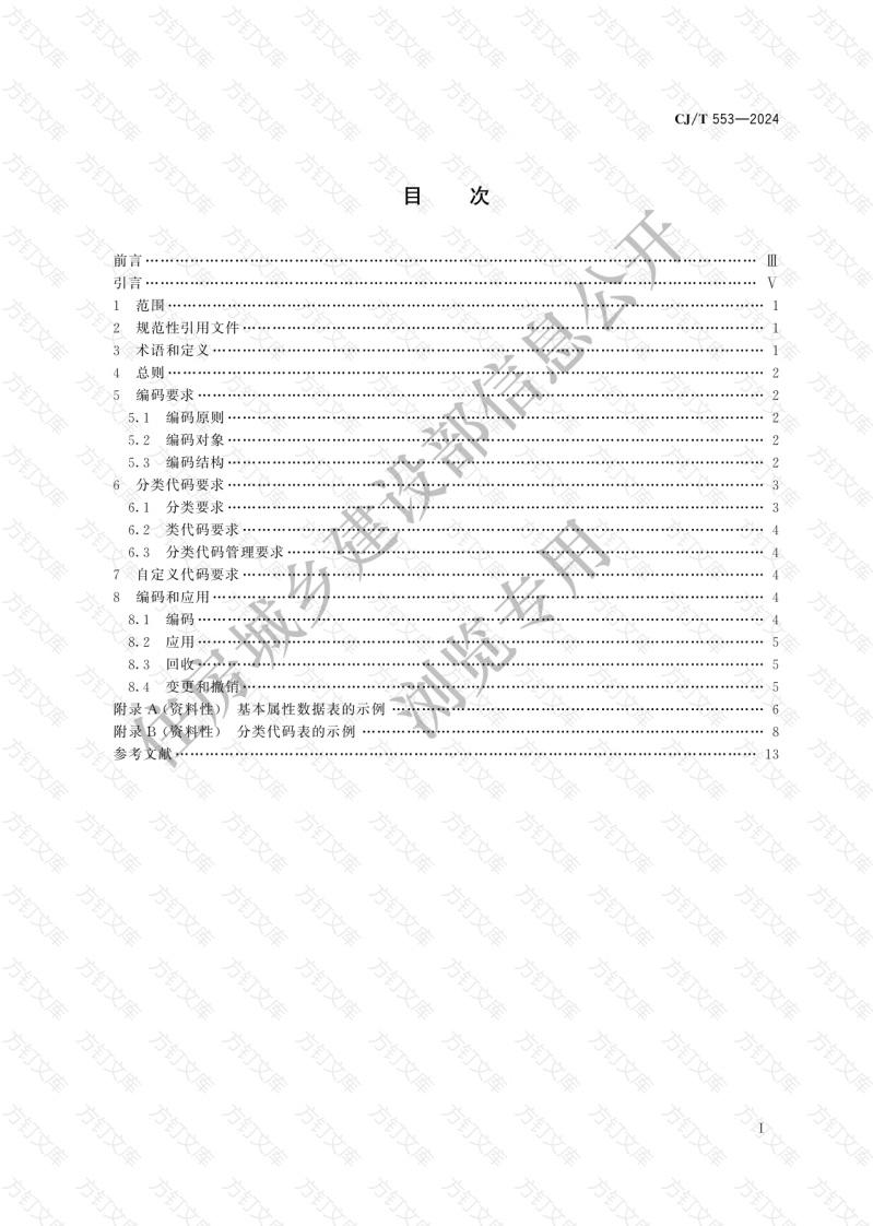 万方方C/T553-2024e次前言引言范围2规范性引用文件……3术语和定义4编码要求…5.1编码原则5.2编码对象…5.3编码结构分类代码要求6.1分类要求6.2类代码要求6.3分类代码管理要求7自定义代码要求编码和应用8.1编码8.2应用…8.3回收8.4附录A资料性)基本属性数据表的示例附录B资料性分类代码表的示例参考文13方万方万文浏览专用文万文文方文方CJ/T553--2024本文件按照GB/T1.1一2020《标准化工作导则第1部分:标准化文件的结构和起草规则》的规定起草请注意本文件的某些内容可能涉及专利。本文件的发布机构不承担识利的贵任本文件由住房和城乡建设部住房改革和发展司提出本文件由住房和城乡建设部信息技术应用标准化技术委员会归本文件起草单位:中国建筑标准设计研究院有限公司北京华易智美城镇规划研究院(有限合伙)、四川九洲北斗导航与位置服务有限公司、湖北省建设信息中,心、襄阳市大数据中心、襄阳市城市运行管理中心,宜昌恒泰大数据产业发展有限公司,宜昌城市大脑运营管理有限公司、广州市智慧城市投资运营有限公司、奥格科技股份有限公司、中交第二公路勘察设计研究院有限公司、中交第二航务工程勘察设计院有限公司、湖北省数字产业发展集团有限公司,北京市市政工程设计研究总院有限公司、中国市政工程华北设计研究总院有限公司、北京数字政通科技股份有限公司、中国城市规划设计研究院、湖北省标准化与质量研究院、汉江智行科技有限公司、吉奥时空信息技术股份有限公司、中治武勘工程技术有限公司、四川省公路规划勘察设计研究院有限公司、重庆市设计院有限公司、重庆市市政设计研究院有限公司、中建二局集团建设发展有限公司、◆中建局第二建设安装有限公司、中建三局第一建设工程有限责任公司、中铁城际规划建设有限公司本文件主要起草人李存东、梁峰、邹江、王新平、宋福平、张华、秦威、屈伟、陈曦、杨桓陈彭进双、陈中治聂俊,李博闻、王圣伟、朱方君、王洪深、石亚男、丁凡、李艳霞、柳谦、胡林、刘坤朱毅汪畅鲁志俊刘卫未、胡钰、赵延军、刘艳峰、吴雨。方万文方方订万