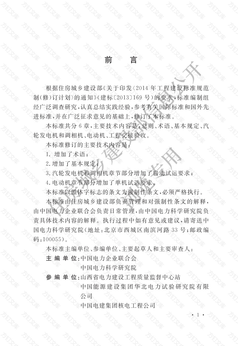 文方前言根据住房城乡建设部《关于印发〈2014年工程建设标准规范制(修)订计划>的通知》(建标〔2013)169号)的要求,标准编制组经广泛调查研究,认真总结实践经验,参考有关国际标准和国外先进标准,并在广泛征求意见的基础上,修订了本标准本标准共分6章,主要技术内容是总则、术语、基本规定、汽轮发电机和调相机、电动机、工程交接验收本标准修订的主要技术内容是1.增加了术语;2.增加了基本规定:3.汽轮发电机和调相机章节部分增加了启动试运要求4.电动机章节部分增加了单机试运要球本标准以黑体字标志的条文为强制性条文,必须严格执行。本标准由住房城乡建设部负责管理和对强制性条文的解释,由中国电力企业联合会负责日常管理,由中国电力科学研究院负责具体技术内容的解释。执行过程中如有意见或建议,请寄送中国电力科学研究院(地址:北京市西城区南滨河路33号;邮政编码:100055)本标准主编单位、参编单位、主要起草人和主要审查人:主编单位:中国电力企业联合会中国电力科学研究院参编单位:山西省电力建设工程质量监督中心站中国能源建设集团华北电力试验研究院有限公司中国电建集团核电工程公司山东电力建设第工程公司中国能源建设集团广东火电工程有限公司河南送变电公司主要起草人:葛占雨武英利田晓沈枢郝志刚田海涛魏国柱曾广宇谷伟姜世昭廖晓华戴荣中荆津琛主要审查人:宋国贵吴克芬高鹏飞刘世华龙庆芝许茂生赵军王玉明陈长王国民董纪国方浏览专用方文万文方方订次总则2术语3基本规定汽轮发电机和调相机4.1般规定4.2保管、搬运和起吊4.3定子和转子的安装4.4集电环、电刷及同轴励4.5冷却系统的安装4.6干燥启动试电动机般155.2保管和起吊155.3检查和安装155.4单机试运18工程交接验收20本标准用词说明22引用标准名录23方方方订