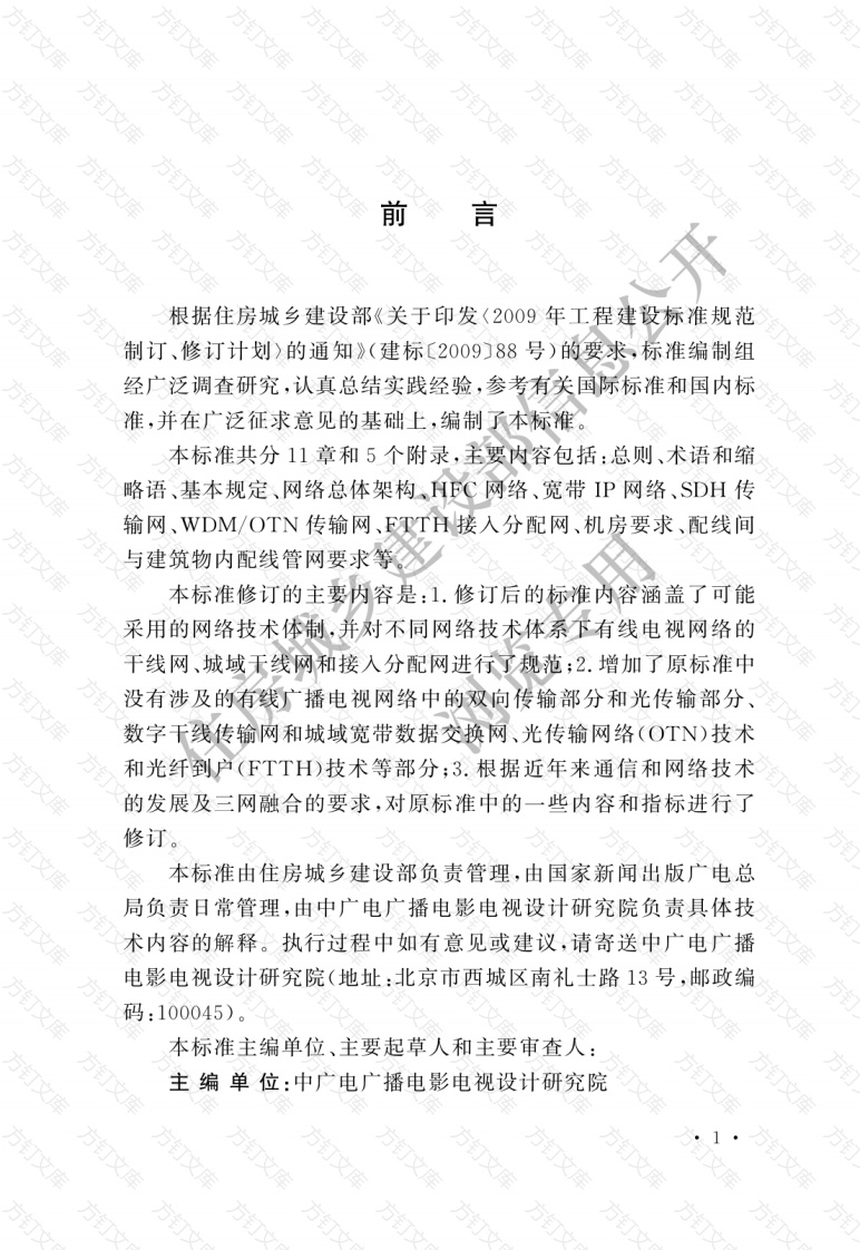 文方前根据住房城乡建设部《关于印发〈2009年工程建设标准规范制订、修订计划)的通知》(建标〔2009)88号)的要求,标准编制组经广泛调查研究,认真总结实践经验,参考有关国际标准和国内标准,并在广泛征求意见的基础上,编制了本标准本标准共分11章和5个附录,主要内容包括:总则、术语和缩略语、基本规定、网络总体架构、HC网络、宽带IP网络、SDH传输网、WDM/OTN传输网、FTH接人分配网、机房要求、配线间与建筑物内配线管网要求等。本标准修订的主要内容是:1.修订后的标准内容涵盖了可能采用的网络技术体制,并对不同网络技术体系下有线电视网络的干线网、城域于线网和接入分配网进行了规范;2.增加了原标准中没有涉及的有线广播电视网络中的双向传输部分和光传输部分、数字干线传输网和城域宽带数据交换网、光传输网络(OTN)技术和光纤到户(FTTH)技术等部分;3.根据近年来通信和网络技术的发展及三网融合的要求,对原标准中的一些内容和指标进行了修订。本标准由住房城乡建设部负责管理,由国家新闻出版广电总局负责日常管理,由中广电广播电影电视设计研究院负责具体技术内容的解释。执行过程中如有意见或建议,请寄送中广电广播电影电视设计研究院(地址:北京市西城区南礼士路13号,邮政编码:100045)本标准主编单位、主要起草人和主要审查人主编单位:中广电广播电影电视设计研究院武汉市广播电视台主要起草人:李丹江郭改荣张海亮主要审查人:秦龑龙曹峰陈德泽崔竞飞韩鹏黄国安黄健叶向东张信纯章加兴方住房城乡建设部信息公浏览专用万文文万方方目次万文总则2术语和缩略语2.1术语2.2缩略语基本规定93.1设计原则3.2业务类型3.3工作环境温度0网络总体架构4.1前端114.2网络124.3网络14HFC网络175.1波段及频道划分175.2上下行通路指标175.3城域干线网185.4接入分配网215.5网络管理宽带IP网络(25)6.1般要求256.2干线网286.3城域干线网296.4接入分配网306.5网络管理30