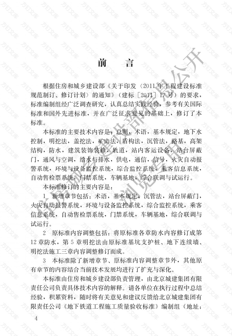 方前言根据住房和城乡建设部《关于印发(2011年丕程建设标准规范制订、修订计划〉的通知》(建标[20☑1号)的要求标准编制组经广泛调查研究,认真总结实践经验,参考有关国际标准和国外先进标准,并在广泛征求意见的基础上,修订了本标准。本标准的主要技术内容是:总则,术语,基本规定,地下水控制,明挖法,盖挖法,汕法,盾构法,沉管法,路基,高架结构,防水,建筑装饰装修轨道,站内客运设备,站台屏蔽门,通风与空调,给水与排水,供电,通信,信号,火灾自动报警系统,环境与设备监控系统,综合监控系统,乘客信息系统,自动售检票系统门禁系统,车辆基地、综合联调与试运行。本标准修订的主要内容是:1新增章节包括:术语,基本规定,沉管法,站台屏蔽门,火灾自动报警系统,环境与设备监控系统,综合监控系统,乘客信息系统,自动售检票系统,门禁系统,车辆基地,综合联调与试运行。2原标准内容调整包括:将原标准各章防水内容修订成第12章防水,第5章明挖法由原标准基坑支护桩、地下连续墙明挖法施工三章内容调整修订而成。3本标准除了新增章节、原标准内容调整章节外,其他原有章节的内容结合当前技术发展均进行了扩充与深化。本标准由住房和城乡建设部负责管理,由北京城建集团有限责任公司负责具体技术内容的解释。请各单位在执行过程中总结经验,积累资料,随时将有关意见和建议反馈给北京城建集团有限责任公司《地下铁道工程施工质量验收标准》编制组北京市海淀区北太平庄路18号北京城建大厦,邮编:100088)。本标准主编单位:北京城建集团有限责任公本标准参编单位:上海隧道工程有限公司上海申通地铁集团有限公北京市轨道交通建设管理有限公司广州地铁集团有限公司中国建筑科学研究院有限公司中铁隧道局集团有限公司中国铁路通信信号股份有限公司中铁电气化局集团有限公司中铁局集团有限公司东省基础工程集团有限公司北京地铁监理公司北京城建轨道交通建设工程有限公司北京城建安装集团有限公司北京城建勘测设计研究院有限责任公司北京港源建筑装饰工程有限公司起草员:张晋勋武福美黄陆川杜刘光武钟显奇丁树奎安伟光毕湘利李永鹏林云志郑宜枫方俊波徐红阳王良曹旭明金淮赵彦兵孙宪春潘庆瑞方订高文新丁志坚潘伟强高存成恽军徐光苗许建得吴健刘嘉军冯雪英曹德志纪学文林志元陈洁王志伟于纪利冯燕媛石福先孟凡辉李凤伟张劭袁敏正朱胜利刘刚陈令强王大庆吴朝东石从军周刘刚方恩权孙柏辉戴彦华万文胡少峰李宏文洪翔彭志勇郝春雷李琨张礼舜杨宏伟王炯窦同江本标准主要审查人员:施仲衡张弥丁复华贺长俊徐明杰杨广武张张汎陈韶章郭建国江玉生杜运国钟长平王简炼申大川高俊霞孟庆礼吴煊鹏鲁娄永梅,张琼燕李显煜住房城乡建浏览专用文方钉万文