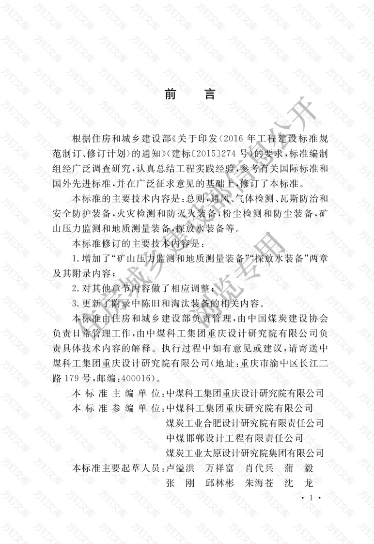 文方方前言根据住房和城乡建设部《关于印发〈2016年工程建设标准规范制订、修订计划)的通知》(建标〔2015)274号的要求,标准编制组经广泛调查研究,认真总结工程实践经验,参考有关国际标准和国外先进标准,并在广泛征求意见的基础上,修订了本标准本标准的主要技术内容是:总则通风、气体检测、瓦斯防治和安全防护装备,火灾检测和防灭火装备,粉尘检测和防尘装备,山压力监测和地质测量装备探放水装备等本标准修订的主要技术内容是:1.增加了“矿山压力监测和地质测量装备”“探放水装备”两章及其附录内容;2.对其他章节内容做了相应调整3.更新了附录中陈旧和淘汰装备的相关内容本标准由住房和城乡建设部负责管理,由中国煤炭建设协会负责日常管理工作,由中煤科工集团重庆设计研究院有限公司负责具体技术内容的解释。执行过程中如有意见或建议,请寄送中煤科工集团重庆设计研究院有限公司(地址:重庆市渝中区长江二路179号,邮编:400016)本标准主编单位:中煤科工集团重庆设计研究院有限公司本标准参编单位:中煤科工集团重庆研究院有限公司煤炭工业合肥设计研究院有限责任公司中煤邯郸设计工程有限责任公司煤炭工业太原设计研究院集团有限公司本标准主要起草人员:卢溢洪万祥富肖代兵蒲毅张邱林彬朱海苍沈龙李旭霞武丙信刘超生杜子健周厚权王勇吴如喜陈李坤樊秀志本标准主要审查人员:冯冠学于为芹张纯如张安林付小敏刘庆礼郑纪顺李明钉住房城乡建设部信息方文方浏览专用方文万文文万文文次总则通风、气体检测、瓦斯防治和安全防护装备2.1通风检测装备2.2气体检测装备2.3瓦斯检测和防治装备2.4安全防护装备3火灾检测和防灭火装备3.1火灾检测装备3.2防灭火装备粉尘检测和防尘粉尘检测装备4.2防尘装煤层注水装备5矿山压力监测和地质测量装备5.1矿山压力监测装备5.2地质测量装备106探放水装备12附录A通风、气体检测和安全防护装备配备13附录B瓦斯基本参数测定装备配备17附录C煤与瓦斯突出矿井突出检测及防突装备配备.18附录D火灾检测和防灭火装备配备附录E粉尘检测和防尘装备配备21附录F煤层注水装备配备22附录G矿山压力监测和地质测量装备配备25