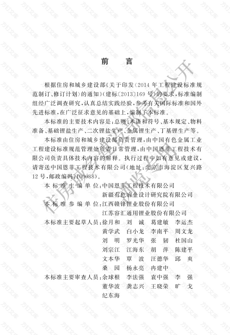方前根据住房和城乡建设部《关于印发〈2014年工程建设标准规范制订、修订计划>的通知》(建标〔2013)169号)的要求,标准编制组经广泛调查研究,认真总结实践经验,参考有关国际标准和国外先进标准,在广泛征求意见的基础上,编制了本标准本标准的主要技术内容是:总则术语和符号、基本规定、物料准备、基础锂盐生产、二次锂盐生产、金属锂生产、丁基锂生产等。本标准由住房和城乡建设部负责管理,由中国有色金属工业工程建设标准规范管理处负责日常管理,由中国恩菲工程技术有限公司负责具体技术内容的解释。执行过程中如有意见或建议,请寄送中国恩菲王程技术有限公司(地址:北京市海淀区复兴路12号,邮政编码:T00038)。本标准编单位:中国恩菲工程技术有限公司新疆有色冶金设计研究院有限公司参编单位:江西赣锋锂业股份有限公司江苏容汇通用锂业股份有限公司标准主要起草人员:徐月和刘诚葛建敏李运杰黄学武白小龙李南平周文龙刘明罗光华张韧杜国山刘宗江江海东胡萍陈建平文本华覃波汪德华邱爽桑园杨永亮冉建中本标准主要审查人员:余球根李法强袁中强李强董华波龚志兴王晓荣纪东海万万方方目次万文万文总则术语和符号2.1术语2.2符号3基本规定3.1技术路线选择3.2装备水平3.3技术经济指标3.4治金计算3.5综合利用3.6检测与控制3.7环境保护节约能源、消防、安全3.8总平面布16物料准备184.1原料184.2辅助材料194.3燃料225基础锂盐生产255.1技术路线255.2锂矿提锂完成液的制取265.3卤水锂盐精矿制取苛化完成液295.4卤水制取氣化锂完成液295.5碳酸锂生30氢氧化锂生产315.7氯化锂生.4325.8脱硝析钠33)5.9产品干燥及包装33)5.10设备与管线材料选择345.11工艺布置35)6二次锂盐生产366.1高纯碳酸锂、电池级碳酸锂36)6.2电池级单水氢氧化锂376.3氟化锂37金属锂生产397.1技术路线397.2电解397.3提纯熔铸39)7.4产品包装及储运407.5氣气回收与尾气40)7.6工艺布置41)8丁基锂生产438.1技术路线43)8.2生产卫艺及设备43)8.3产品包装及储运458.4工艺布置46)附录A锂冶炼主要工艺技术条件47)本标准用词说明51引用标准名录(52)方万万万文