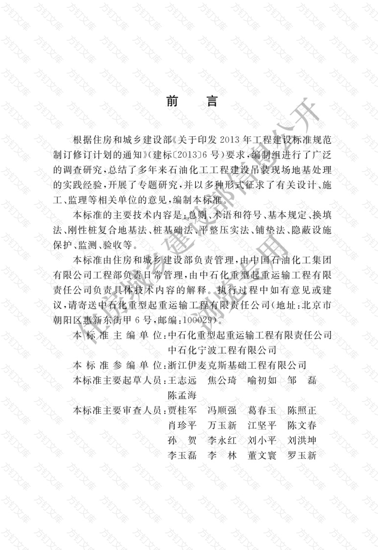 文万文前根据住房和城乡建设部《关于印发2013年工程建设标准规范制订修订计划的通知》(建标〔2013)6号)要求,编制组进行了广泛的调查研究,总结了多年来石油化工工程建设吊装现场地基处理的实践经验,开展了专题研究,并以多种形式征求了有关设计、施工、监理等相关单位的意见,编制本标准本标准的主要技术内容是:总则、术语和符号、基本规定、换填法、刚性桩复合地基法、桩基础法、平整压实法、铺垫法、隐蔽设施保护、监测、验收等。本标准由住房和城乡建设部负责管理,由中国石油化工集团有限公司工程部负责日常管理,由中石化重型起重运输工程有限责任公司负责具体技术内容的解释。执行过程中如有意见或建议,请寄送中石化重型起重运输工程有限责任公司(地址:北京市朝阳区惠新东街甲6号,邮编:100029)。本标准主编单位:中石化重型起重运输工程有限责任公司中石化宁波工程有限公司本标准参编单位:浙江伊麦克斯基础工程有限公司本标准主要起草人员:王志远焦公琦喻初如邹磊陈孟海本标准主要审查人员:贾桂军冯顺强葛春玉陈照正肖珍平万玉新江坚平陈文春孙贺李永红刘小平刘洪坤李玉磊李林董文寰罗玉新万文万万万方次万文总则2术语和符号2.1术语2.2符号3基本规定换填法4.1设计4.2施工5刚性桩复合地基法125.1设计122施工146桩基础法156.1设计156.2施16平整压实法177.1设计177.2施工178铺垫法199隐蔽设施保护2010监测2211验收23附录A吊装现场岩土的分类25附录B换填法吊装地基承载力计算和校核27附录C隐蔽设施保护方法示意图29本标准用词说明34引用标准名录35住房城乡建设部信息公开浏览专用
