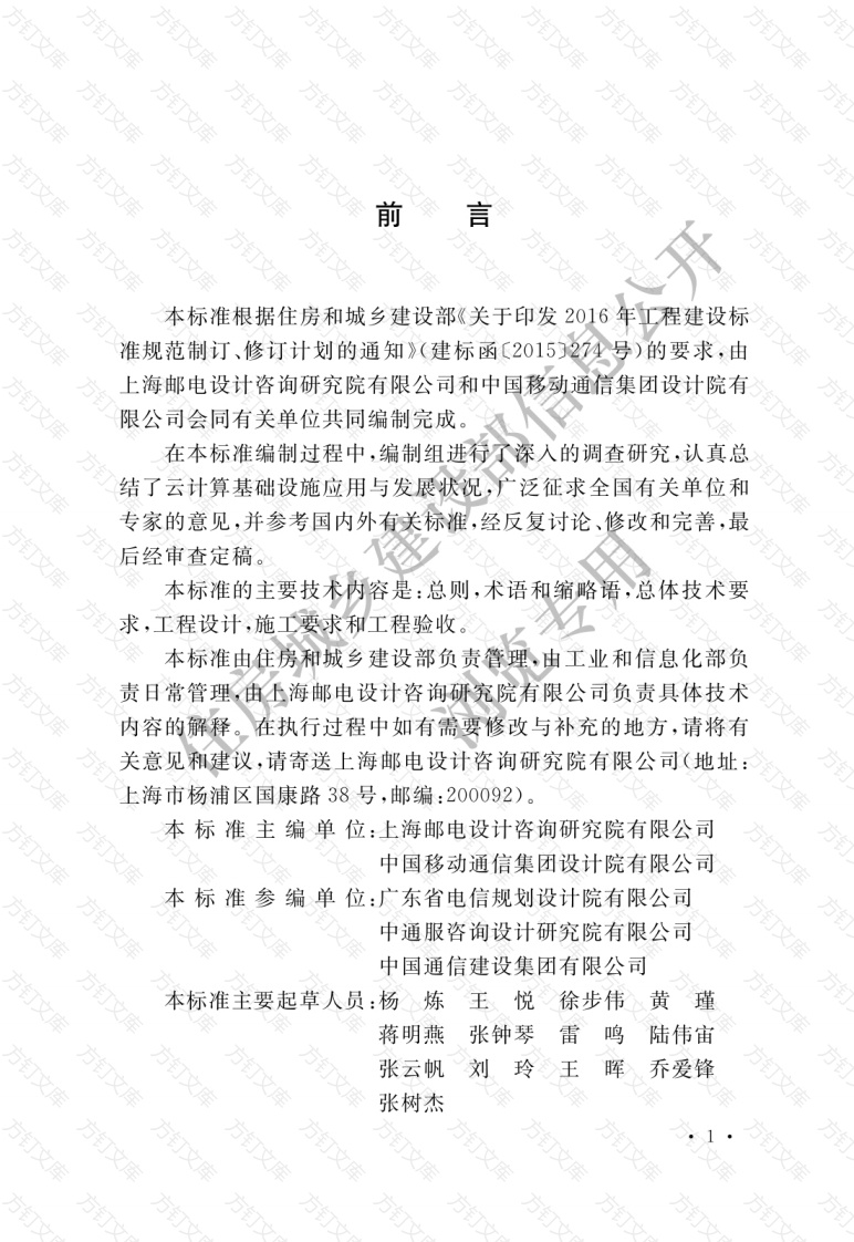 文方方万文本标准根据住房和城乡建设部《关于印发2016年工程建设标准规范制订、修订计划的通知》(建标函C2015)27少号)的要求,由上海邮电设计咨询研究院有限公司和中国移动通信集团设计院有限公司会同有关单位共同编制完成。在本标准编制过程中,编制组进行了深入的调查研究,认真总结了云计算基础设施应用与发展状况,广泛征求全国有关单位和专家的意见,并参考国内外有关标准,经反复讨论、修改和完善,最后经审查定稿本标准的主要技术内容是:总则,术语和缩略语,总体技术要求,工程设计,施工要求和工程验收。本标准由住房和城乡建设部负责管理,由工业和信息化部负责日常管理,由还海邮电设计咨询研究院有限公司负责具体技术内容的解释。在执行过程中如有需要修改与补充的地方,请将有关意见和建议,请寄送上海邮电设计咨询研究院有限公司(地址:上海市杨浦区国康路38号,邮编:200092)。本标准主编单位:上海邮电设计咨询研究院有限公司中国移动通信集团设计院有限公司本标准参编单位:广东省电信规划设计院有限公司中通服咨询设计研究院有限公司中国通信建设集团有限公司本标准主要起草人员:杨炼王悦徐步伟黄瑾蒋明燕张钟琴雷鸣陆伟宙张云帆刘玲王晖乔爱锋张树杰本标准主要审查人员:洪亮赵以爽魏征张培丰戴刚童天顾戎侯乐孙惠琴严学来王海飞吴慧敏方住房城乡建设部信息公开曾君亮王文浏览专用万方方文目次万总则2术语和缩略语2.1术语2.2缩略语3总体技术要求3.1总体架构3.2功能要求工程设计般要求4.2业务参数4.3网络架构4资源池层次划分4.5设备配置104.6带宽计算4.7管理功能144.8机房设备布置155施工要求175.1机房及环境要求175.2安装要求17工程验收206.1验收前准备206.2工程初验要求213试运行及竣工验收23