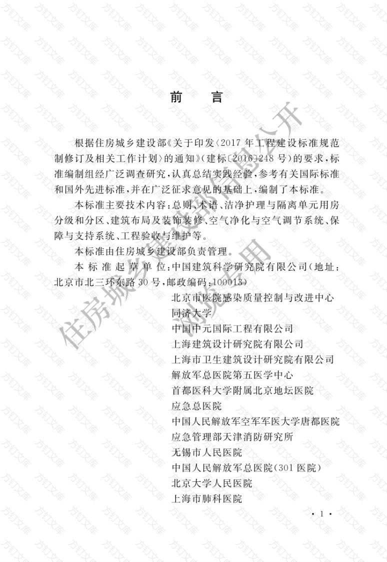 文方前言根据住房城乡建设部《关于印发(2017年工程建设标准规范制修订及相关工作计划)的通知》(建标〔2016]248号)的要求,标准编制组经广泛调查研究,认真总结实践经验,参考有关国际标准和国外先进标准,并在广泛征求意见的基础上,编制了本标准本标准主要技术内容:总则术语、洁净护理与隔离单元用房分级和分区、建筑布局及装饰装修、空气净化与空气调节系统、保障与支持系统、工程验收与维护等本标准由住房城乡建设部负责管理。本标准起莫单位:中国建筑科学研究院有限公司(地址北京市北三环东路30号,邮政编码:100013)北京市医院感染质量控制与改进中心同济大学中国中元国际工程有限公司上海建筑设计研究院有限公司上海市卫生建筑设计研究院有限公司解放军,总医院第五医学中心首都医科大学附属北京地坛医院应急总医院中国人民解放军空军军医大学唐都医院应急管理部天津消防研究所方订无锡市人民医院中国人民解放军总医院(301医院)北京大学人民医院上海市肺科医院华中科技大学同济医学院附属协和医院国家空调设备质量监督检验中心方江苏省疾病预防控制中心北京市医院建筑协会北京文康世纪科技发展有限公司中国建筑技术集团有限公司北京融通新风洁净技术有限公司北京明朗洁净技术服务有限公司北京世纪盛通环境工程技术有限公司北京建研洁源科技发展有限公司北京中瑞电子系统工程设计院有限公司海风神环境设备工程有限公司天津市龙川净化卫程有限公司天津安美环境科技工程有限公司天津市津航净化空调工程公司江苏达实久信医疗科技有限公司江苏环亚医用科技集团股份有限公司江苏苏净科技有限公司苏州华迪医疗科技有限公司苏州通快净化科技有限公司吴江市绿岛净化工程有限公司西安四腾环境科技有限公司四川桑瑞思环境技术工程有限公司四川科创源洁净工程有限公司宁夏鑫吉海医疗工程有限公司武汉华康世纪医疗股份有限公司郑州瑞孚净化股份有限公司万广州市桂勤器械设备工程有限公司苍龙集团有限公司本标准主要起草人员:许钟麟曹国庆武迎宏沈晋明刘燕敏袁白妹陈严建敏王维平刘扬钟秀玲谢江宏倪照鹏沈崇德张彦国陈众励孙鲁春陈虎匡季秋杨永梅方肖伟智张益昭潘红红梁磊牛维乐谢景欣俞国华卢联合王文一姚勇张文科徐喆周安蔡斌吴丽娟闫彩萍玉传文赵长斌樊学柏黄德强陶麒蒋乃军施爱蕊马兆勇顾春林白浩强吴建军王钢陈琳炜范俏颜武杨智超王炳静标准主要审杳吴德绳龚京蓓刘晓雷胡道涛革马骏郝学安赵琳徐宏庆王鸿莲梁琳任玉良周力姚希赵奇侠刘杨方订万文