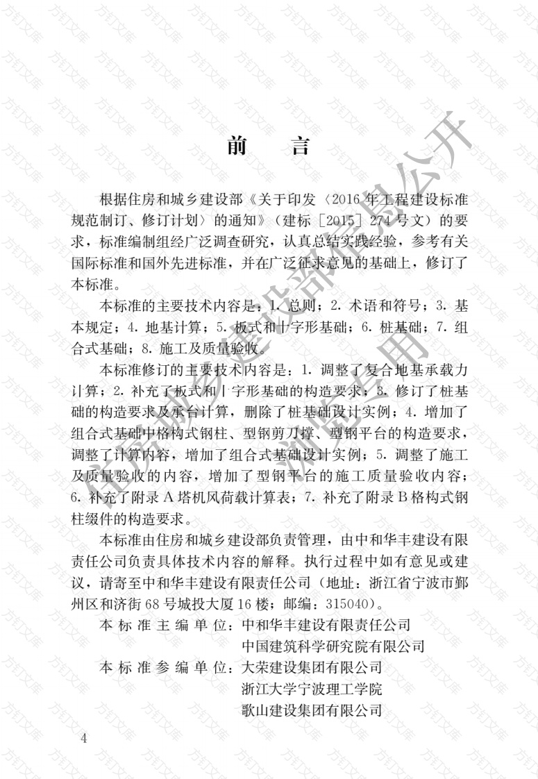 万文前言根据住房和城乡建设部《关于印发(2016年玉程建设标准规范制订、修订计划〉的通知》(建标[2015]274号文)的要求,标准编制组经广泛调查研究,认真总结实践经验,参考有关国际标准和国外先进标准,并在广泛征求意见的基础上,修订了本标准。本标准的主要技术内容是:1总则;2.术语和符号;3.基本规定;4.地基计算;5.板式和字形基础;6.桩基础;7.组合式基础;8.施工及质量验收本标准修订的主要技术内容是:1.调整了复合地基承载力修订了桩基础的构造要求及承台计算,删除了桩基础设计实例;4.增加了组合式基础中格构式钢柱、型钢剪刀小撑、型钢平台的构造要求,调整了计算内容,增加了组合式基础设计实例;5.调整了施工及质量验收的内容,增加了型钢平台的施工质量验收内容;6.补充了附录A塔机风荷载计算表;7.补充了附录B格构式钢柱缀件的构造要求。本标准由住房和城乡建设部负责管理,由中和华丰建设有限责任公司负责具体技术内容的解释。执行过程中如有意见或建议,请寄至中和华丰建设有限责任公司(地址:浙江省宁波市鄞州区和济街68号城投大厦16楼;邮编:315040)本标准主编单位:中和华丰建设有限责任公司中国建筑科学研究院有限公司衣标准参编单位:大荣建设集团有限公司浙江大学宁波理工学院歌山建设集团有限公司方方华锦建设集团股份有限公司方浙江省建设机械集团有限公司中建六局建设发展有限公司中建三局第三建设工程有限责任公司宁波宁大工程建设监理有限公司宁波市民用建筑设计研究院有限公司重庆建工第九建设有限公司四川琨盛建筑工程有限公司本标准主要起草人员:方美财罗文龙华锦耀白海敏潘伟峰国玉赵剑泉方鹏飞吴恩定张辉许国伟管小军熊楚炎于海祥丁小华本标准主要审查人员李守林应惠清刘兴旺汤坤林华建民栾景阳新玉姚圣龙住房城乡陈云龙方方订万方万目次万文总则2术语和符号2.1术语2.2符号3基本规定6地基计算84.1地基承载力计算8地基变形计算134.3地基稳定性计算13155.1般规定155.2构造要求155.3基础计算166桩基础186般规定186.2构造要求186.3桩基计算206.4承台计算22组合式基础277.1般规定277.2基础构造287.3基础计算29施工及质量验收348.1基础施工348.2地基土检查验收356