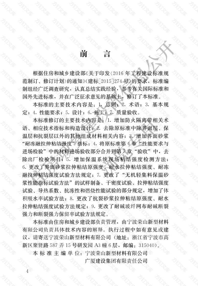 方万万万文言根据住房和城乡建设部《关于印发〈2016年卫程建设标准规范制订、修订计划)的通知》(建标2015]274号)的要求,标准编制组经广泛调查研究,认真总结实践经验,参考有关国际标准和国外先进标准,并在广泛征求意见的基础上,修订了本标准本标准的主要技术内容是:人总则2。术语;3.基本规4.性能要求;5.设计;6.施亚7.质量验收。本标准修订的主要技术内容是:1.增加防火隔离带相关术语、相应技术指标和构造设计,2.去除原标准中除界面层、保温层和抗裂层以外的其他组成材料相关内容;3,增加界面砂浆“耐冻融拉伸粘结强度指标;4.将原标准第章“性能要求与进场检验”中的材料进场验收部分合并到第入章“验收”中,去除出厂检验项目;5.增加保温系统现场粘结强度检测方法;6.更改了界面砂浆拉伸粘结原强度耐冰拉伸粘结强度、耐冻融拉伸粘结强度试验方法规定;7.更改了“无机轻集料保温砂浆性能指标试验方法”的试样制备、干密度试验、拉伸粘结强度试验、导热系数、抗冻性和燃烧性能试验的部分规定,增加了体积吸水率试验方法;8.更改了抗裂砂浆拉伸粘结原强度、耐水拉伸粘结强度试验方法规定;9.更改了耐碱玻纤网布耐碱断裂强力和断裂强力保留率试验方法规定。本标准由住房和城乡建设部负责管理,由宁波荣山新型材料有限公司负责具体技术内容的解释。执行过程中如有意见或建议,请寄送宁波荣山新型材料有限公司(地址:浙江省宁波市高新区聚贤路587弄15号研发园A3幢6层,邮编:315040)本标准主编单位:宁波荣山新型材料有限公司广厦建设集团有限责任公司标准参编单位:中国建筑材料科学研究总院有限公司上海市建筑科学研究院(集团)有限公司浙江省建筑科学设计研究院有限公司河南省建筑科学研究院有限公司江西省建筑科学研究院同济大学方浙江大学宁波工程方华南理郑州大学波市建筑工程安全质量监督总站昆山长绿环保建材有限公司中厦建设集团有限公司住房城乡中国建筑第七工程局有限公司重庆坤飞建设(集团)有限公司杭州泰富龙新型建筑材料有限公司南阳银通节能建材高新技术开发有限公司宁波和邦检测研究有限公司宁波世纪豪龙建材有限公司宁波建工工程集团有限公司宁波市轨道交通集团有限公司宁波东部新城开发投资集团有限公司台州市建设工程设计审查中心本标准主要起草人员:王小山金振屠浩驰潘国华吕明张永明华治国王智宇殷顺湖林庆芳郭良徐建军王海波马华飞刘哲张峻金剑波庄继昌蒋松发栾景阳朱国亮王宝玉邱跃华涂建永李陆宝罗春尹向红黄刘勇朱晓玲本标准主要审查人员:郑洪武杨玉忠厉天数张雪芹刘芳高旭东吴和平住房城乡建设部信桑方圆浏览专用钉方钉万文