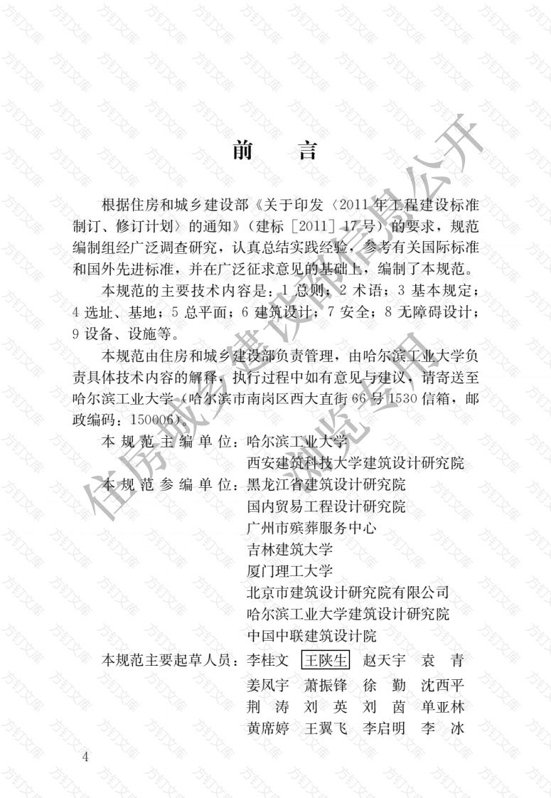 方方前根据住房和城乡建设部《关于印发(2011年玉程建设标准制订、修订计划〉的通知》(建标[2011]17号)的要求,规范编制组经广泛调查研究,认真总结实践经验,参考有关国际标准和国外先进标准,并在广泛征求意见的基础上,编制了本规范4选址、基地;5总平面;6建筑设计;7安全;8无障碍设计;9设备、设施等。本规范由住房和城乡建设部负责管理,由哈尔滨工业大学负责具体技术内容的解释,执行过程中如有意见与建议,请寄送至哈尔滨工业大学(哈尔滨市南岗区西大直街66号1530信箱,邮政编码:150006)。本规范主编单位:哈尔滨工业大学西安建筑科技大学建筑设计研究院参编单位:黑龙江省建筑设计研究院国内贸易工程设计研究院文广州市殡葬服务中心吉林建筑大学厦门理工大学北京市建筑设计研究院有限公司哈尔滨工业大学建筑设计研究院中国中联建筑设计院本规范主要起草人员:李桂文赵天宇袁姜凤宇萧振锋徐勤沈西平荆涛刘英刘单亚林黄席婷王翼飞李启明李冰方许勇铁侯兰英陈雨梅岗万文岳斌佑徐聪智金梦潇郝英舒赵博周丹曹玉琪赵群郑权王盈本规范主要审查人员:刘燕辉刘远孝肖成龙陈飙叶吉林张险峰陈向明住房城乡建设部信李子军浏览专用方钉方方订方方方方方万次总则2术语3基本规定选址、基地4.1选址4.2基地总平面5.1般规定95.2公墓5.3骨灰寄存建筑136建筑设计146.1公墓146.2骨灰楼167安全19公墓197.2骨灰寄存建筑198无障碍设计·229设备、设施249.1给水、排水249.2供暖、通风、空调249.3电气25本规范用词说明26引用标准名录27文文