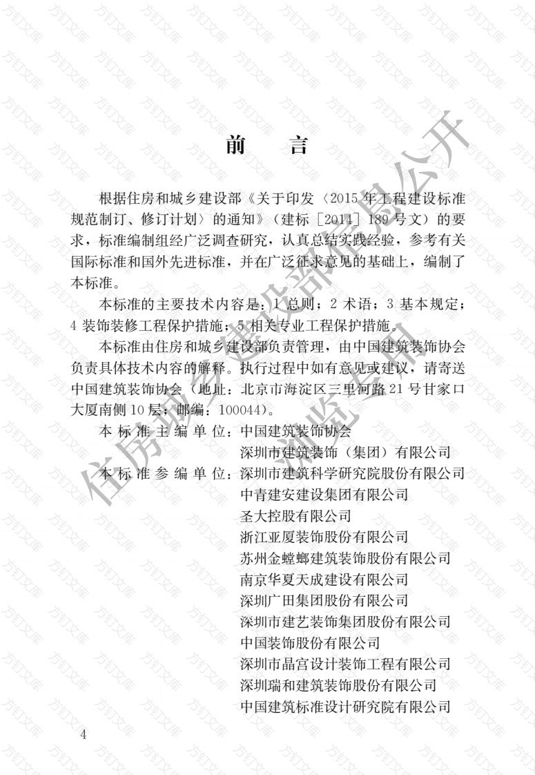 根据住房和城乡建设部《关于印发(2015程建设标准规范制订、修订计划〉的通知》(建标[2014189号文)的要求,标准编制组经广泛调查研究,认真总结实践经验,参考有关国际标准和国外先进标准,并在广泛征求意见的基础上,编制了本标准。本标准的主要技术内容是:总则;2术语;3基本规定;4装饰装修工程保护措施;⑤相关专业工程保护措施本标准由住房和城乡建设部负责管理,由中国建筑装饰协会负责具体技术内容的解释。执行过程中如有意见或建议,请寄送中国建筑装饰协会(地址:北京市海淀区三里河路21号甘家口大厦南侧10层:邮编:100044)。标准主编单位:中国建筑装饰协会深圳市建筑装饰(集团)有限公司参编单位:深圳市建筑科学研究院股份有限公司中青建安建设集团有限公司圣大控股有限公司浙江亚厦装饰股份有限公司苏州金螳螂建筑装饰股份有限公司方订南京华夏天成建设有限公司深圳广田集团股份有限公司深圳市建艺装饰集团股份有限公司中国装饰股份有限公司万深圳市晶宫设计装饰工程有限公司深圳瑞和建筑装饰股份有限公司中国建筑标准设计研究院有限公司方方深圳远鹏装饰集团有限公司方深圳市维业装饰集团股份有限公司东亚装饰股份有限公司万深圳新艺华建筑装饰工程有限公司哈尔滨工业大学深圳市中深装建设集团有限公司深圳市建研检测有限公司江苏鸿升装饰工程有限公司中建深圳装饰有限公司河北建设集团装饰工程有限公司合肥学院本标准主要起草人员王欣黄白任李兆龙景士云何静姿胡本国刘清泉陈国谦田力管作为王晓辉于波邓伟罗兰罗祥林郭同华王鹏周立军王武烈郭卫峰郑春高伟谢海涛蕾员贺卫平王传顺周文连王静刘宴山李磊蒋承红王跃赵洪文霍瑞琴江向东方订方订万次总则2术语3基本规定装饰装修工程保护措施4.1般规定4.2吊顶工程4.3地面工程4.4隔墙工程4.5饰面板(砖)4.6门窗工程4.7抹灰与涂饰工程4.8裱糊与软包工4.9细部工程幕墙工程防水工程5相关专业工程保护措施95.1般规定5.2结构工程95.3给水排水与供暖工程105.4通风与空调工程105.5电气工程115.6电梯工程11本标准用词说明12万文文