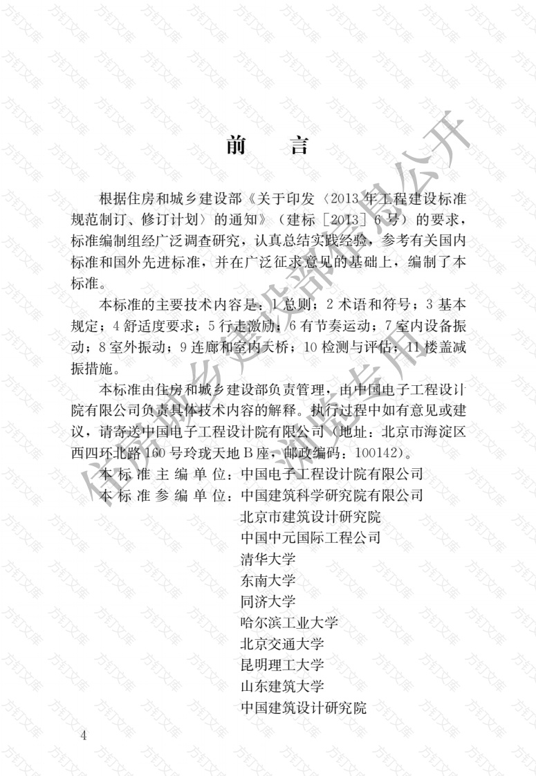 根据住房和城乡建设部《关于印发2013规范制订、修订计划〉的通知》(建标6号)的要求标准编制组经广泛调查研究,认真总结实践经验,参考有关国内标准和国外先进标准,并在广泛征求意见的基础上,编制了本本标准的主要技术内容是:总则:2术语和符号;3基本规定;4舒适度要求;5行走激励:6有节奏运动;7室内设备振动;8室外振动;9连廊和室内天桥;10检测与评估,楼盖减振措施。本标准由住房和城乡建设部负责管理,由市国电子工程设川院有限公司负责具体技术内容的解释。执行过程中如有意见或建议,请寄送中国电子工程设计院有限公司(地址:北京市海淀区西四环北路160号玲珑天地B座,邮政编码:100142)本标准主编单位:中国电子工程设计院有限公司本标准参编单位:中国建筑科学研究院有限公司北京市建筑设计研究院中国中元国际工程公司清华大学东南大学同济大学哈尔滨工业大学方北京交通大学方昆明理工大学万文山东建筑大学万中国建筑设计研究院文华南理工大学万文华东建筑设计研究院有限公司中国恩菲工程技术有限公司中电投工程研究检测评定中心本标准主要起草人员:娄宇吕佐超黄健任庆英潘鹏张志强童乐为陈隽宋志刚厂韩小雷束伟农张同亿>李惠杨庆山傅传国田炜翟传明左中杰付国顺张文勇秦敬伟王建本标准主要审查人员:李爱群杨宜谦王昌兴王立军益金伟良冯李庆钢东志强住房城乡浏览专方钉万文文方万目次总则2术语和符号2.1术语2.2符号3基本规定63.1般规定63.2作用和作用组合6舒适度要求94.1般规定94.2舒适度限值105行走激励…12文5.1般规定125.2荷载125.3竖向振动加速度136有节奏运动156.1般规定156.2荷载156.3竖向振动加速度167室内设备振动197.1般规定197.2荷载197.3竖向振动加速度208室外振动218.1般规定218.2荷载216