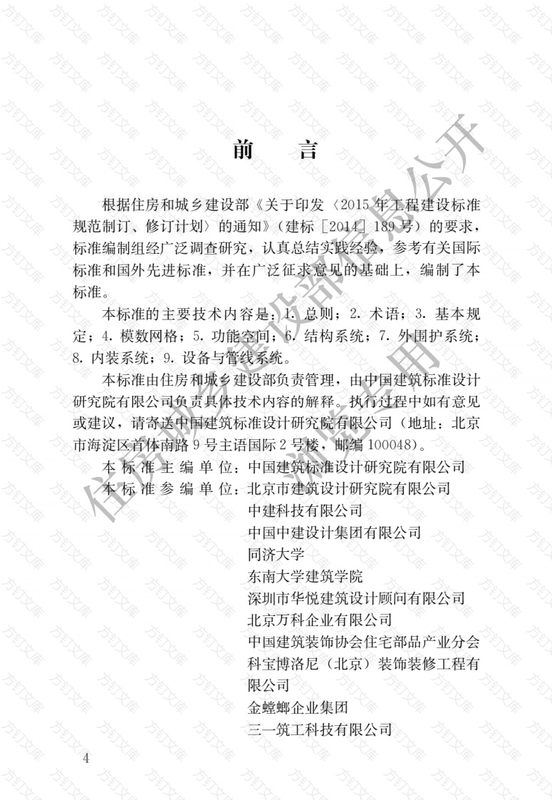 文根据住房和城乡建设部《关于印发(2015年程建设标准规范制订、修订计划〉的通知》(建标[2014189号)的要求标准编制组经广泛调查研究,认真总结实践经验,参考有关国际标准和国外先进标准,并在广泛征求意见的基础上,编制了本标准。本标准的主要技术内容是:。总则;2.术语;3.基本规7.外围护系统;8.内装系统;9.设备与管线系统本标准由住房和城乡建设部负责管理,由中国建筑标准设计研究院有限公司负责具体技术内容的解释。执行过程中如有意见或建议,请寄送中国建筑标准设计研究院有限公司(地址:北京市海淀区首体南路9号主语国际2号楼,邮编100048)本标准主编单位:中国建筑标设计研究院有限公司标参编单位:北京市建筑设计研究院有限公司中建科技有限公司中国中建设计集团有限公司同济大学东南大学建筑学院深圳市华悦建筑设计顾问有限公司北京万科企业有限公司中国建筑装饰协会住宅部品产业分会科宝博洛尼(北京)装饰装修工程有万限公司金螳螂企业集团文筑工科技有限公司文北京维石住工科技有限公司深圳市高新建混凝土有限公司河北奥润顺达窗业有限公司本标准主要起草人员:冯海悦周祥茵朱茜樊则森满孝新周晓红李晓明伍止超林琳郝伟高志强段朝霞李赵中宇张宏窦祖融逯薇胡亚南徐勇刚徐鑫肖明吉第金羽秦珩郭惠斌魏贺东李筱梅标准主要审查人员赵冠谦刘东卫秦盛民赵卢清刚屈国俐陈住房城乡方方订方方订方方方方万目次总则2术语3基本规定模数网格4.1般规定54.2网格确定4.3网格应用4.4网格协调5功能空间5.1般规定5.2公共空间5.3套内空间结构系统1212结构构件与连接13外围护系统157.1般规定157.2外墙围护系统157.3屋面围护系统16内装系统…178.1般规定178.2集成式厨房178.3集成式卫生间188.4隔墙与整体收纳198.5吊顶、楼地面与内门窗196